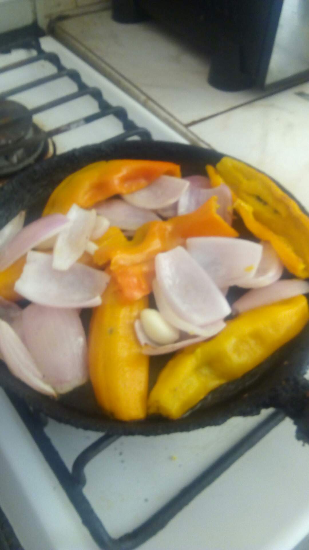 Primero asó el ají amarillo, con la cebolla y el ajo en la sartén