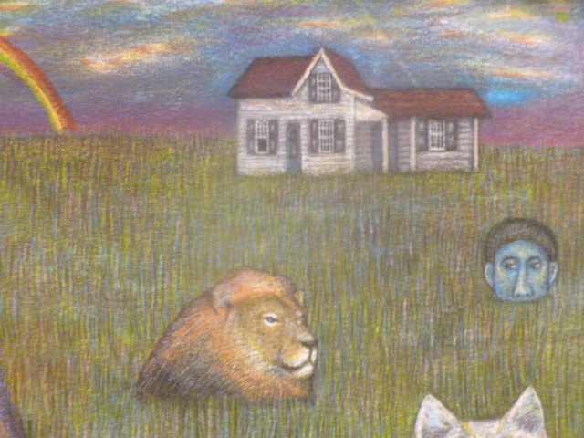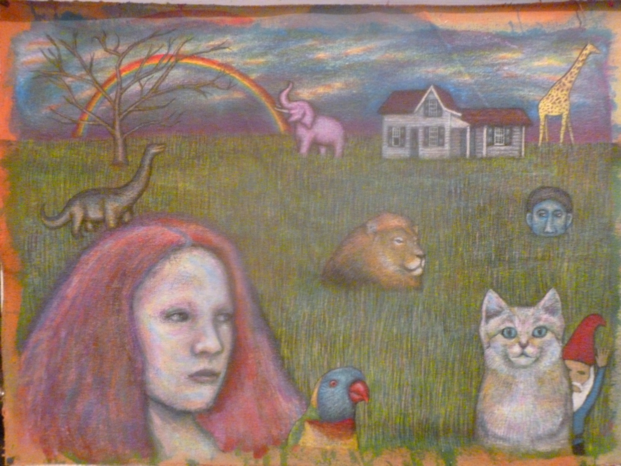 El dinosaurio es el último toque faltante para conferir la mayor irrealidad e interpretaciones poético surrealistas que siempre busco en mis pinturas. El gnomo lamentablemente y a pesar de que en algún momento lo detallé muchísimo, fue eliminado. Estaba fuera de lugar en una pieza cuya muestra de seres de zoo mundos reales o irreales crea cierta armonía conceptual.