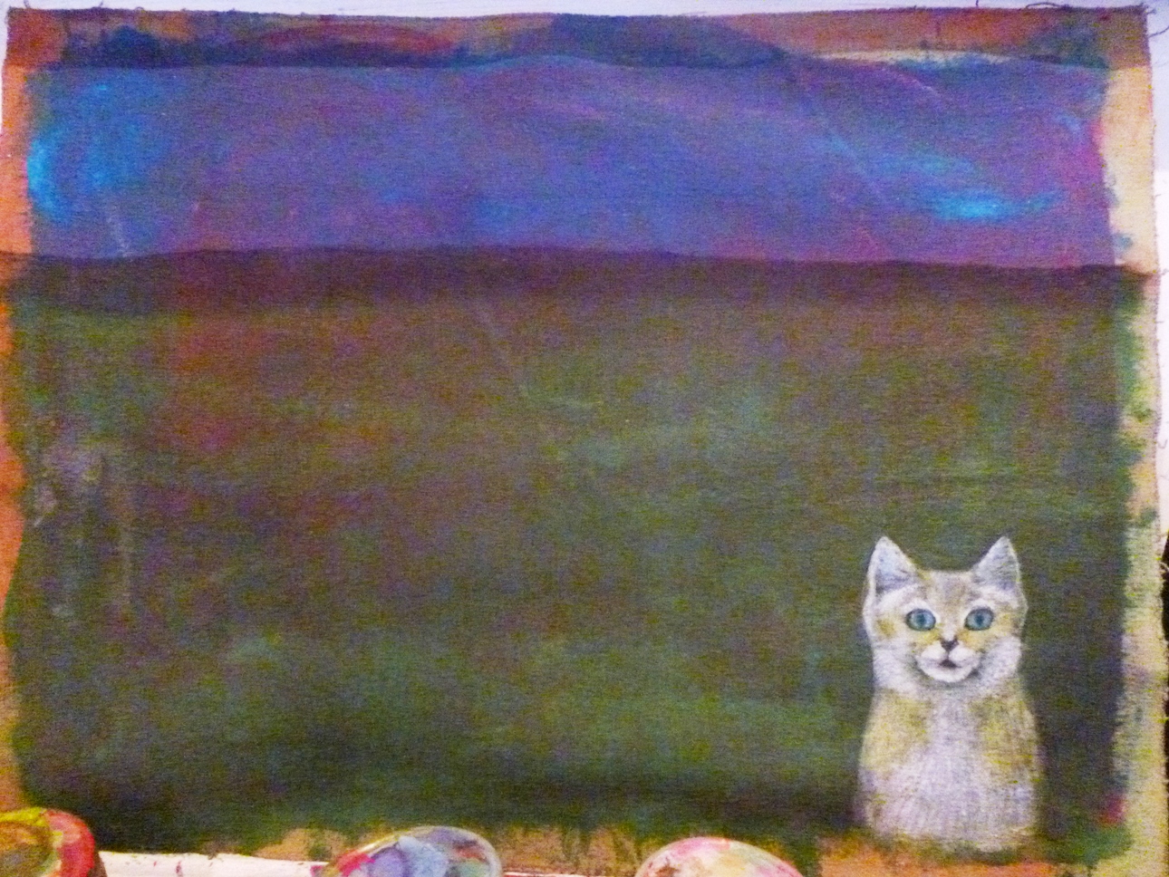 A partir de allí con trazos muy finos hice el efecto de grama, trazos verticales con diversos tonos verdes. Luego, al igual que un director teatral que empieza a darle a sus actores sus puestos correspondientes, empecé a colocar los personajes, el primero fue este gato del desierto africano, cuyo pelaje amarillo le ayuda a camuflajearse entre las arenas del Sahara.