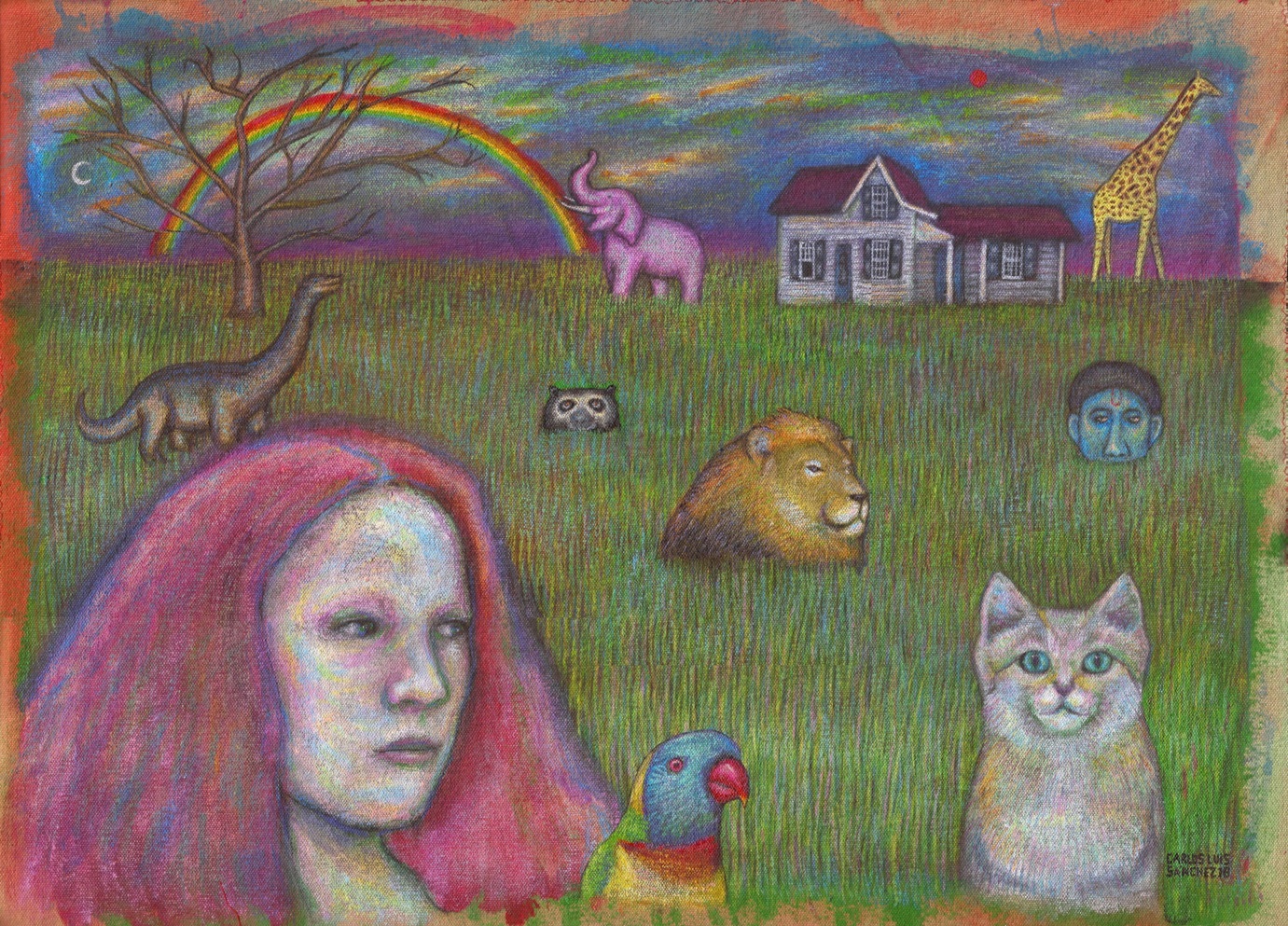 Y así ha quedado finalmente la obra, con un árbol seco que tapase un poco el arcoíris dando efecto de profundidad y mortalidad poética sobre la armonía y la paz de los colores, también un oso frontino asomándose tímido a contemplar la extraña escena de una mujer acechada por fieras de todos los continentes, desde los reales hasta los fantásticos, pasando por los extintos. Muchas gracias por ver mi post, espero haya sido de su agrado y opinen en los comentarios por cualquier duda. Un abrazo desde Carora.