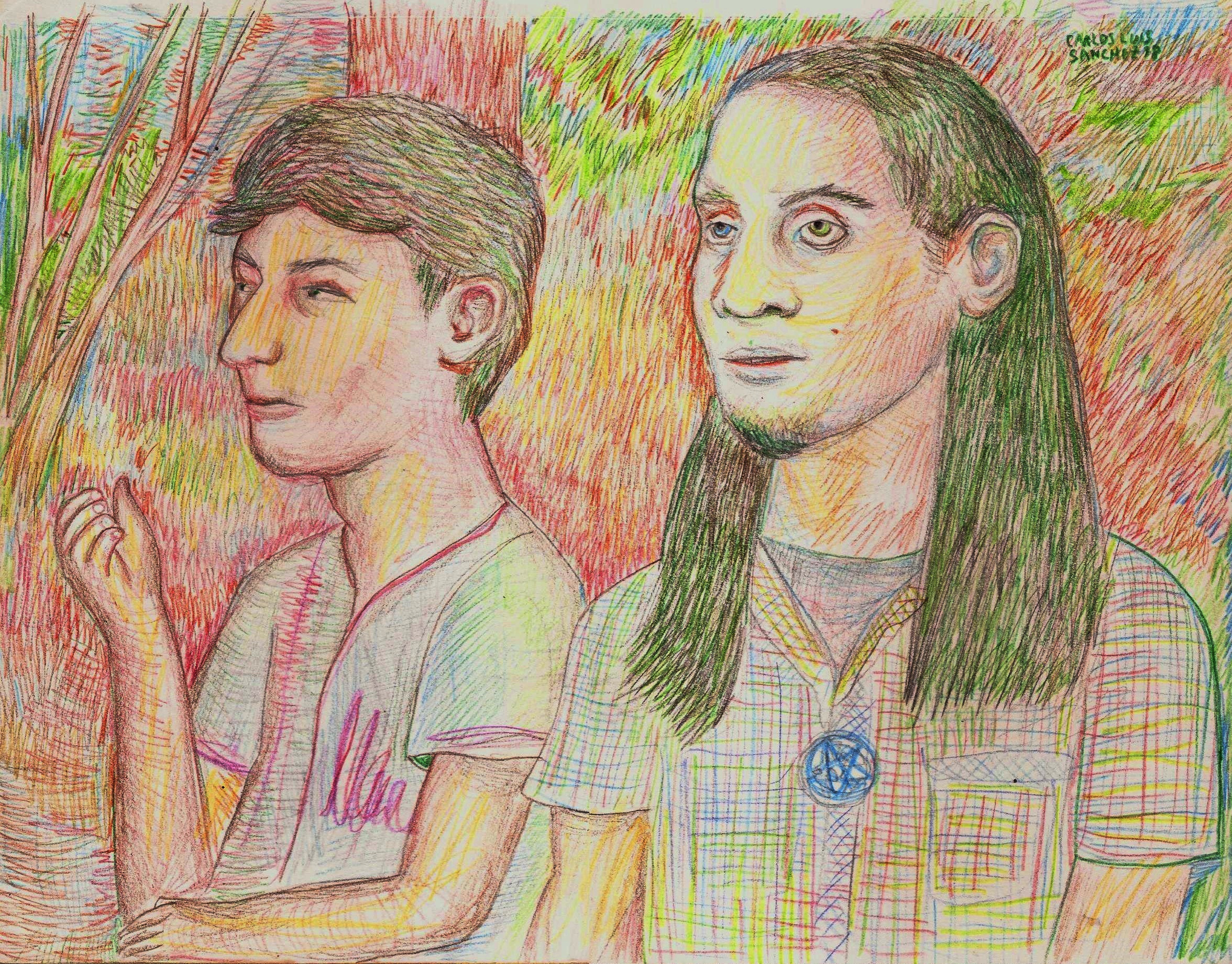En este tercer dibujo están retratados mis amigos Oswaldo y Ronald en frente de un jardín imaginario. Ellos dos son también dibujantes, ambos muy talentosos. Lo que más me gusta de dibujar a mi amigo Ronald es representar su cabello largo de metalero y que me pida que por favor le haga sus enormes lunares lo más pequeños posible, para que no se noten, para luego ver su rostro de sorpresa cuando hago que sus lunares ocupen la mitad de su rostro.