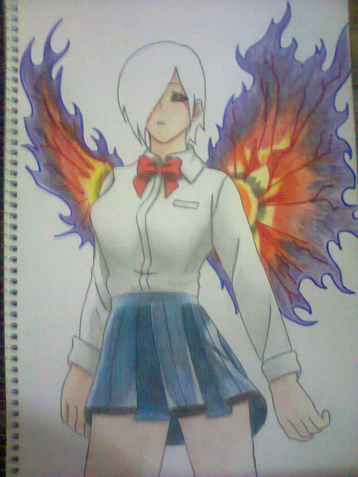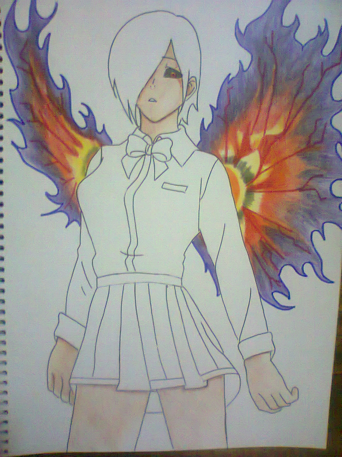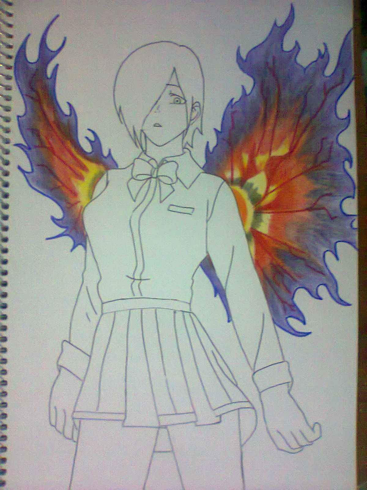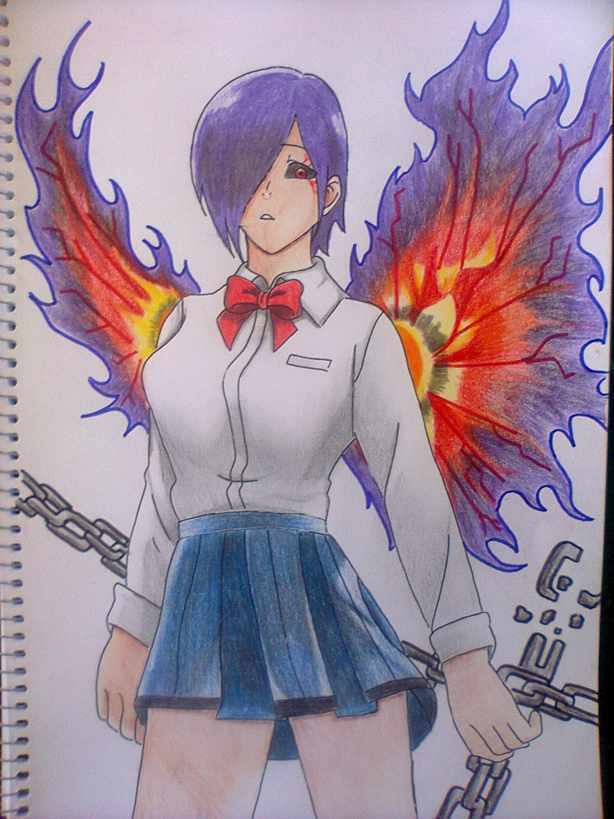 Para esta ocasion les traigo a Touka Kirishima, personaje del anime y manga Tokyo Ghoul, obra creada por el mangaka Sui Ichida, el cual nos ubica en un mundo habitado por Ghouls, una raza en apariencia parecida a la humana, mas, sin embargo estos albergan un voraz apetito, el cual solo puede ser saciado comiendo humanos. La gran caracteristica que diferencia a los Ghouls de los humanos es que estos cuentan con un organo depredador llamado "Kagune", el cual cuando se libera, el físico de un ghoul se fortalece, son más resistentes y su movilidad se ve aumentada; cada Ghoul posee un kagune diferente, y a lo largo de la serie se nos han mostrado Kagunes muy poderosos, asi como tambien muy hermosos. Sin embargo, uno de los que me ha llamado mas la atencion es el de Touka, pues, como podemos apreciar, se manifiesta en forma de dos alas llameantes de vivos colores que tienen la capacidad de cristalizarse y lanzar proyectiles, asi mismo por medio de su kagune Touka puede ejercer la electrokinesis, lo cual la vuelve una adversaria digna de temer.