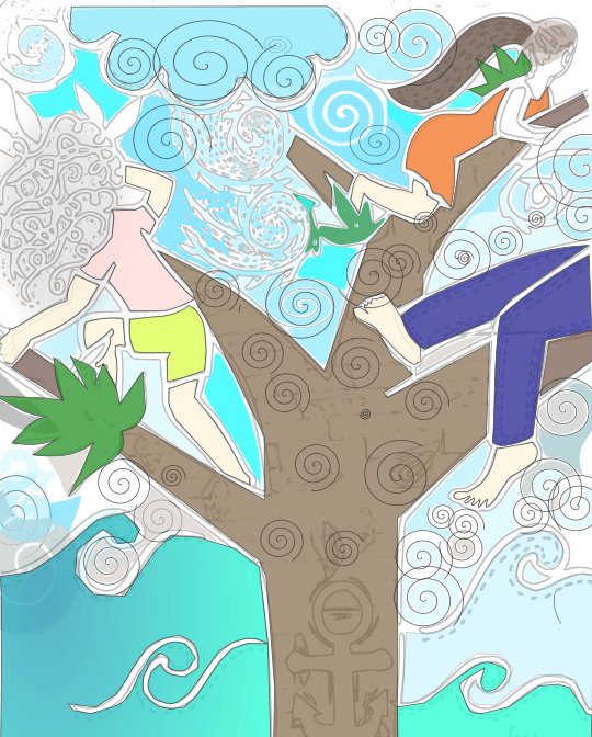 Es vida o muerte. No hay otra opción y sólo juntos podremos lograrlo. Todos columpiamos las ramas hacia la misma dirección con todo el ímpetu de nuestro peso, con la misma furia de un navegante perseguido con remo en mano. El viento está a nuestro favor y nos movemos con mayor velocidad. Es un gran barco hostigado con tres timones que navega enfurecidamente sobre el agua indomable. Nuestros cuerpos se tambalean cual vaivén de los navíos de altamar, mientras nuestras manos imaginan girar un timón y sostener el rumbo con fuerza.