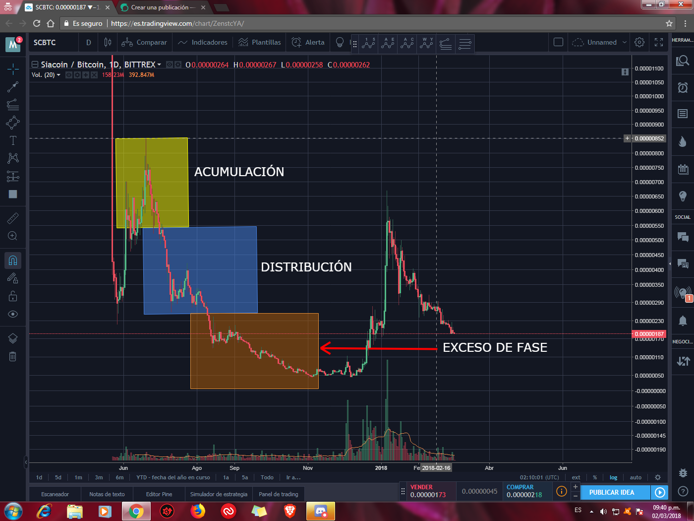 Fase de Acumulación: Es aquella fase en el que las ballenas, los traders de opinión contraria y algunos grandes traders entran a una moneda, en esta etapa el precio está bajo y lo único que hay son proyecciones positivas para el futuro. Aquí es cuando los grandes capitales entran en precio bajos, lo hacen de a poco para que el precio no se infle por la alta demanda que causarían y que luego no puedan comprar a un buen precio. Es sencillo, si una ballena entra de una sola vez a una moneda puede causar una subida, por lo que puede estimular a la mayoría de los traders a entrar y hacer que el precio suba como la espuma y de esa manera no poder comprar bien, es decir al precio que quieren (barato).