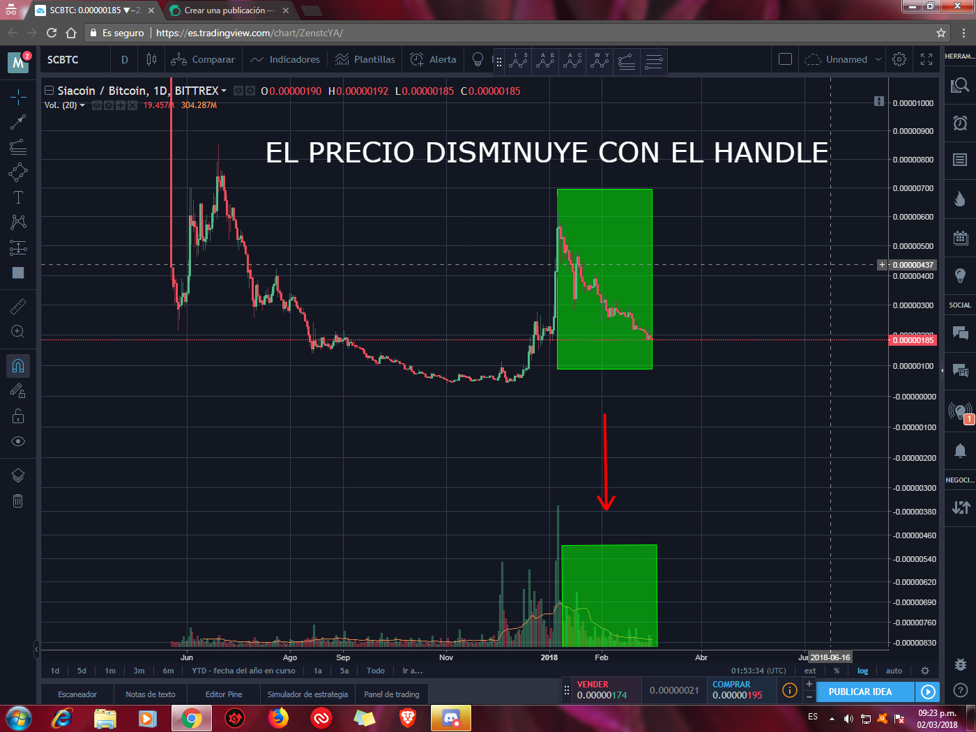 Cuando el precio se encuentra lateral y ya no cae más, comienza la tendencia primaria al alza. El mercado está bajo y poco volátil, en ese momento comienza la fase de Acumulación (alcista) para tradear en largos, los grandes traders y las ballenas empiezan a comprar todo lo que puedan de la moneda, cuando ya tienen todo lo que desean, hacen un chispazo que inicie la fase de Distribución (alcista), donde los demás traders entran y el mercado se vuelve más volátil, en este momento el precio comienza a subir y llega a la zona donde se comienza el Handle, hasta este nivel el precio se encuentra en la “zona Y”, justo el nivel en el que comenzó la fase de Distribución a la baja (cuándo las ballenas tradearon en corto), por lo que algunos traders deciden retirar ganancias, lo que ocasiona que el precio baje un poco y se forme por completo el patrón del Handle. Cuando se culmina el patrón del Handle, comienza el Exceso de fase o exceso de FoMO en este caso, en esta fase gran parte de las personas que salieron llenos de FUD cuando la tendencia estaba a la baja, entran en la moneda por FoMO, los precios suben lo que pueden y terminan de romper y validar el patrón del Handle, el precio aumenta hasta que encuentre resistencia en alguna área (zona X) y todo el proceso se repita de nuevo.