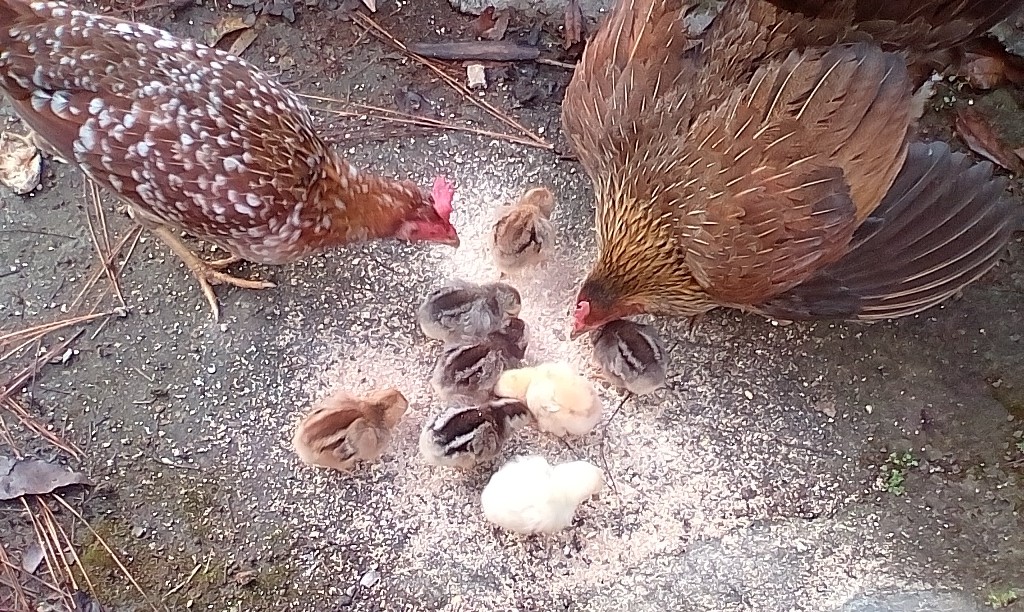Además tenemos un corral donde criamos algunas gallinas. No nos gusta matarlas para comerlas pero aprovechamos los huevos que producen. En la foto se ve una gallina con sus pollitos. La madre está en posición de defender a sus crías. Los pequeños pollos nacieron porque la gallina escondió los huevos y nosotros no nos dimos cuenta de eso hasta que vimos a estas adorables criaturas caminando alegremente por los jardines.