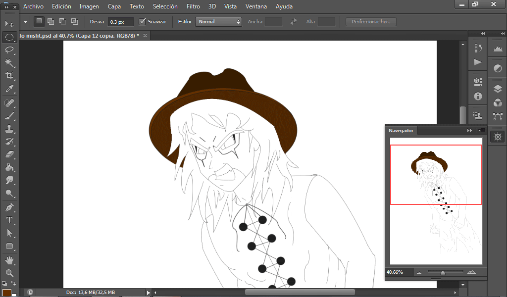 We created the initial sketch that does not have to be perfect and which was done with the brush and freehand, some parts contouring with the pen. Then perfect the drawing by contouring with the pen and the brush 1 px.