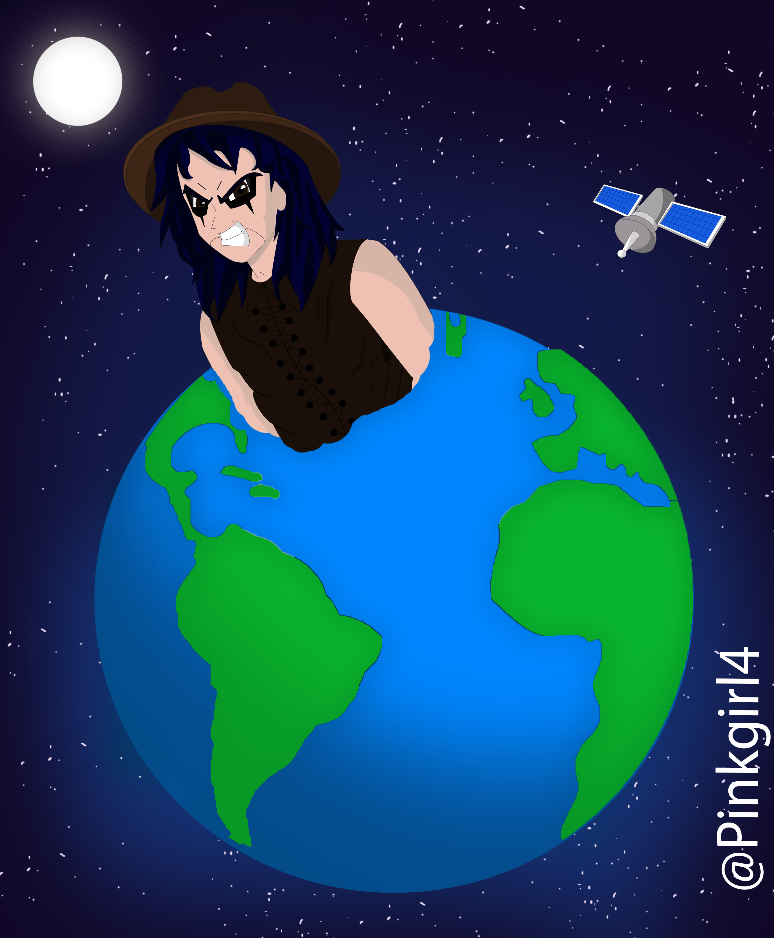 Dibujamos el globo terráqueo con el marco explicito y rellenando con el bote de pintura de azul (para esto podemos ver referencias en internet para saber como están distribuidos los continentes), en otra capa arriba del círculo azul dibujamos los continentes con la pluma y contorneamos para luego rellenar de verde, en esta misma capa vamos a opciones de fusión y seleccionamos sombra paralela y dejamos en mínimo distancia, extensión y tamaño. Luego combinamos capa con el círculo azul, nuevamente nos dirigimos a opciones de fusión y seleccionamos sombra interior. El fondo de realizó usando el pincel y varios tonos de azul de claro a oscuro y la estrellas con puntos blancos hechos con el pincel, el satélite se dibujo con la pluma y el pincel en 1 px.