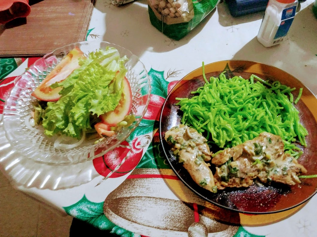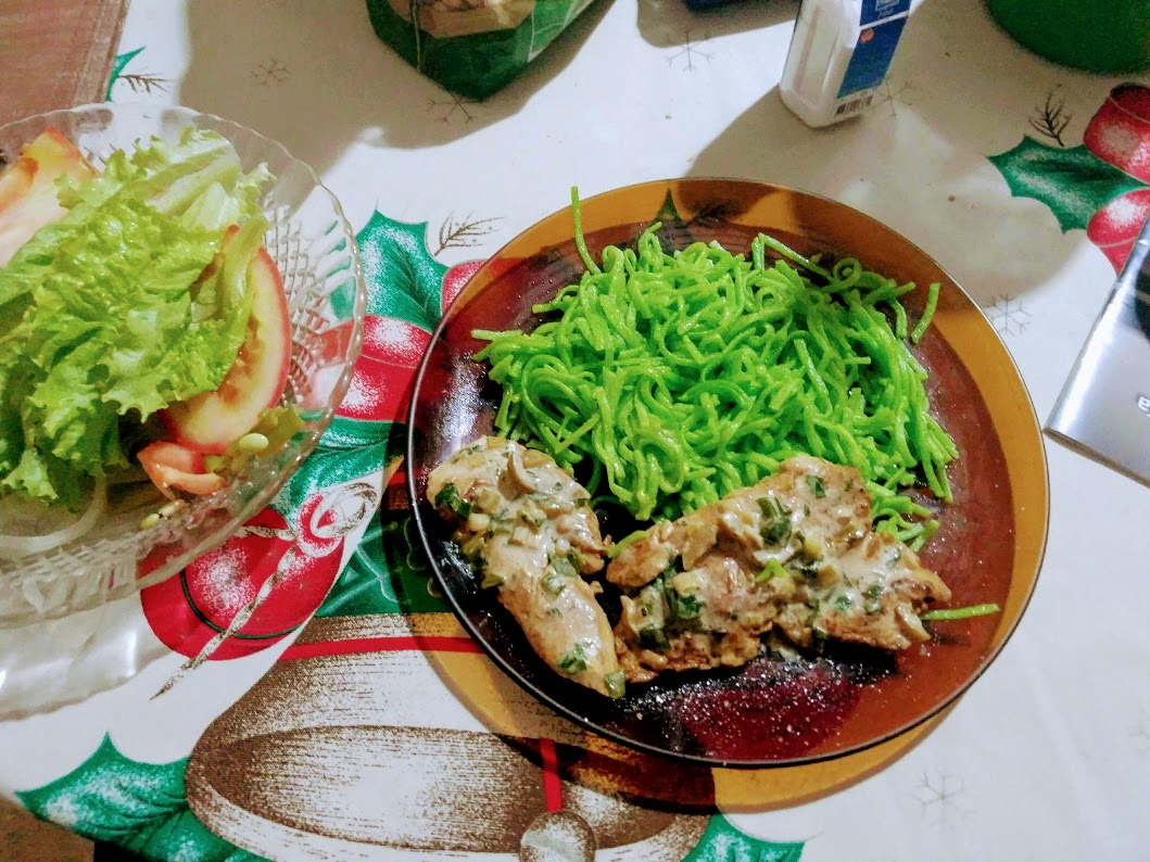 Unos filetes de pollo con espagueti tipo tallarín creo que se llama, estuvo muy rico, una delicia definitivamente, pero las verduras? de noche? mmmm, no es para mi gusto jejeje..