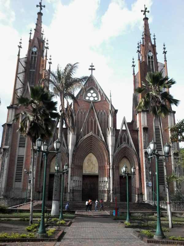 Estas columnas de cemento sostienen el enorme peso de las agujas y de las torretas menores que las adornan. Son torres gemelas. Están recubiertas de ladrillo y ostentan grandes varales de hierro. Entre ambas torres se abre la puerta principal y dos puertas laterales menores; los tres pórticos siguen el modelo del gótico clásico: arco ojival, no de medio punto y archivotes del mismo estilo. La puerta central tiene nueve archivotes.
