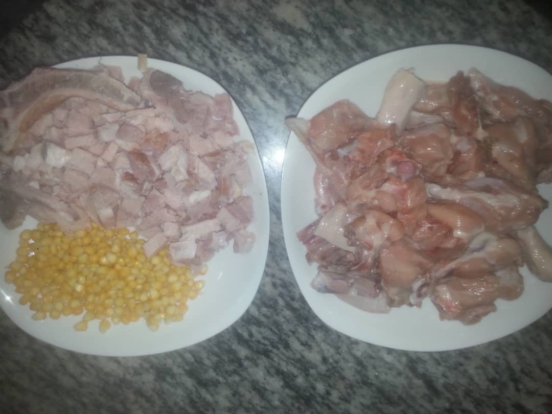 Cortemos el Pollo en piezas pequeñas, las chuletas ahumadas, las papas y las zanahorias en cuadritos pequeños y todo lo demás en Juliana