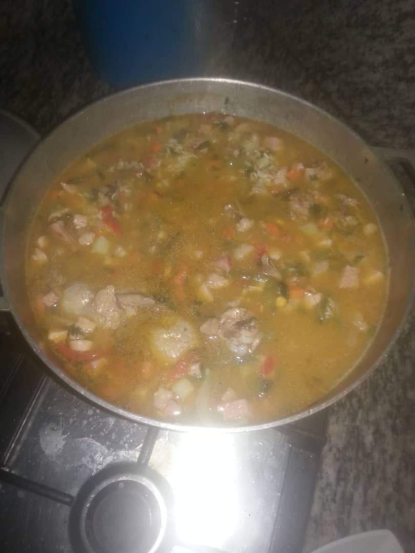 Luego le incluimos los maíz y las chuletas ahumadas. Seguidamente le agregamos el arroz y el agua y para finalizar los cubitos, sal, pimienta y aliño al gusto.