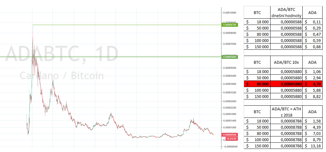 Kdybychom brali "realisticky-optimistickou" variantu, tedy nárůst kurzu ADA/BTC 10x, což je hodnota, kde se ADA/BTC již pohybovala v minulém vrcholu v lednu 2018, dostaneme se na kurz 0,0000588.