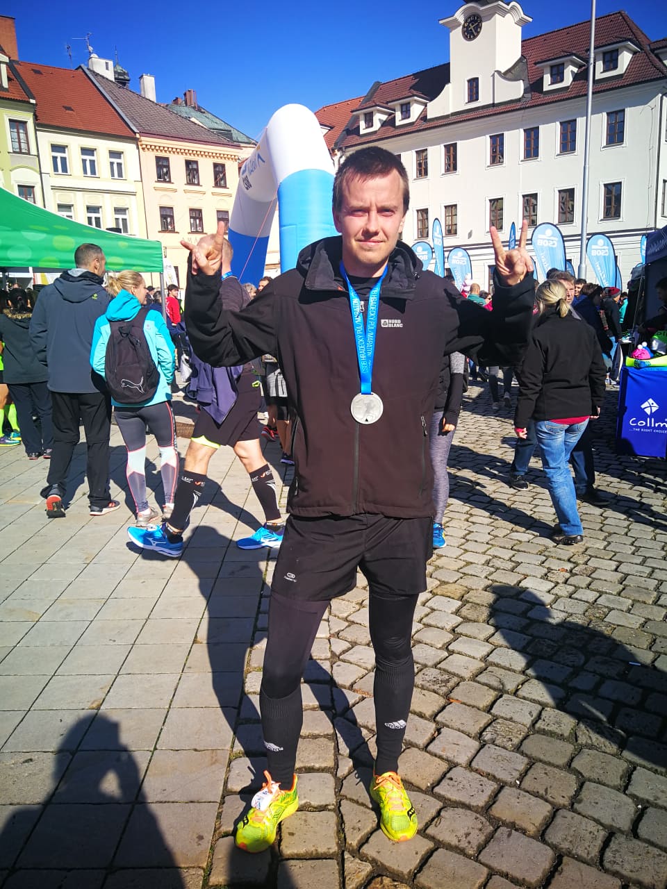 Když mi odpadl kolega, začal jsem soutěžit s časem. Věděl jsem, že průměrně běžím cca lehce pod 5 minut na kilometr a pokud to dokážu stlačit, můžu atakovat i vysněných 1:45:00 a tak jsem to zkusil. Na zhruba 18 kilometru už jsem věděl, že jestli mě nepotká mozková mrtvice, infarkt a nebo křeč, tak doběhnu na real-time (čas na čip) těsně pod. A opravdovej zázrak se stal na kilometru 19, když jsem před sebou uviděl vodiče na 1:45:00, o kterým jsem do tý doby ani netušil, že na trati je (v propozici se psalo, že vodiči jsou po 10 minutách). Takže cíl pro poslední dva kilometry byl, doběhnout ho. To se nakonec povedlo na posledním kiláku s tím, že nám hlásil, že doběhneme pravděpodobně lehce před limitem. Protože trochu zpomalil, aby ještě dodal trochu psychický vzpruhy ostatním, tak jsem ho předběhl a doběhl si do cíle s časem 1:43:44 (umístění někde na chvostu první třetiny závodního pole). Od prvního půlmaratonu před rokem a půl v Pardubicích mám tedy zlepšení něco přes 16 minut. Což je překvapení i pro mě, protože zase tolik toho za měsíc neodběhám.