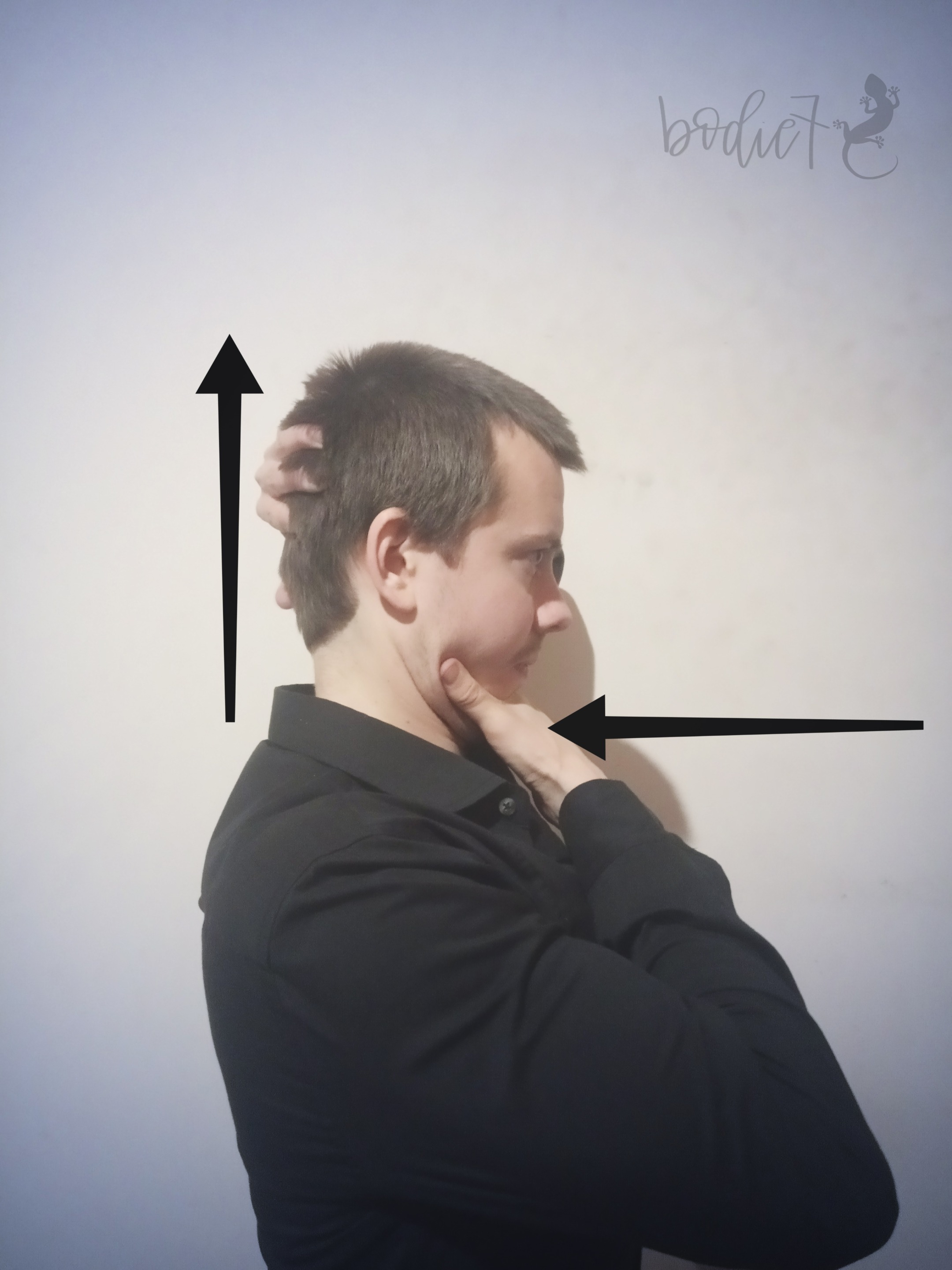 Tenhle cvik se dá dělat s ručníkem za hlavou, nebo stačí šikovný ruce. Každopádně bych si dal trochu pozor na tu organizaci páteře. Takže se posadit hezky vzpříma jak se říká. To znamená na sedací kosti (nohy celým chodidlem na zemi) a vytáhnout se za to "cédéčko" na hlavě směrem nahoru. Nezvedat bradu, nestahovat lopatky k sobě (to je dost zbytečná práce navíc). Ani se nelámat v bedrech (klidně je vlastně můžete nechat na volno poklesnout). Když to uděláte a podíváte se do zrcadla, tak ucho by mělo bejt zhruba nad ramenem, hrudní páteř otevřená (zkrátka nesedíte jako vopičáci s ramenama dopředu). No a pak si buď dáte někam pod týl hlavy ručník a jemně a zlehka zatáhnete směrem nahoru (jako kdybyste chtěli odtáhnout uši co nejdál od ramen) a nebo si dáte jednu ruku na bradu jako na obrázku a druhou na týl. Bradu lehce zasunete (prosim vás někdo to dělá tak, že se pak nemůže ani nedechnout, tak takhle ne. Zlehka, přirozeně. Dýchejte volně) a druhou rukou zase zkoušíte zlehka hlavu "oddělit" od ramen (ty přitom necháte volně klesat dolů). Dá se to taky mimochodem dělat zády ke zdi (nebo vleže na zemi). Stejnej princip. Srovnáte páteř (v tomhle případě ramena a záda přitlačíte na zeď) a zase hlavu budete tahat směrem od ramen a bradu tlačíte dovnitř.