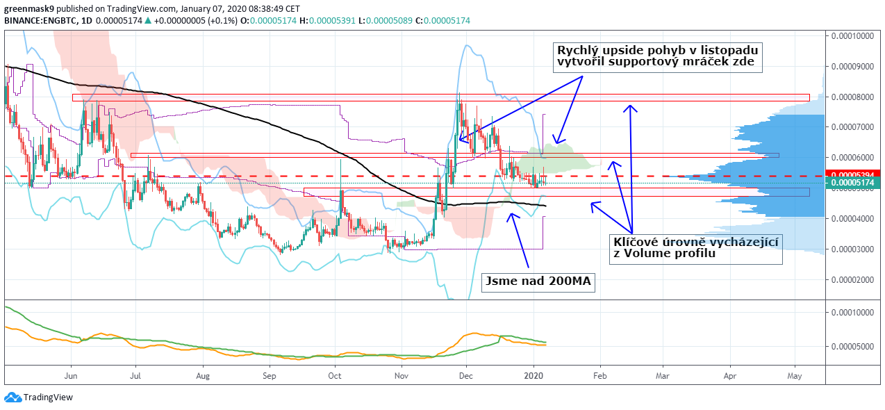 Začátkem listopadu enigma v páru s bitcoinem znatelně vyrostla. Od prosince je v korekci a nyní naráží na low volume area, které se může zachovat jako support a umožnit pokračování uptrendu další vlnou.
