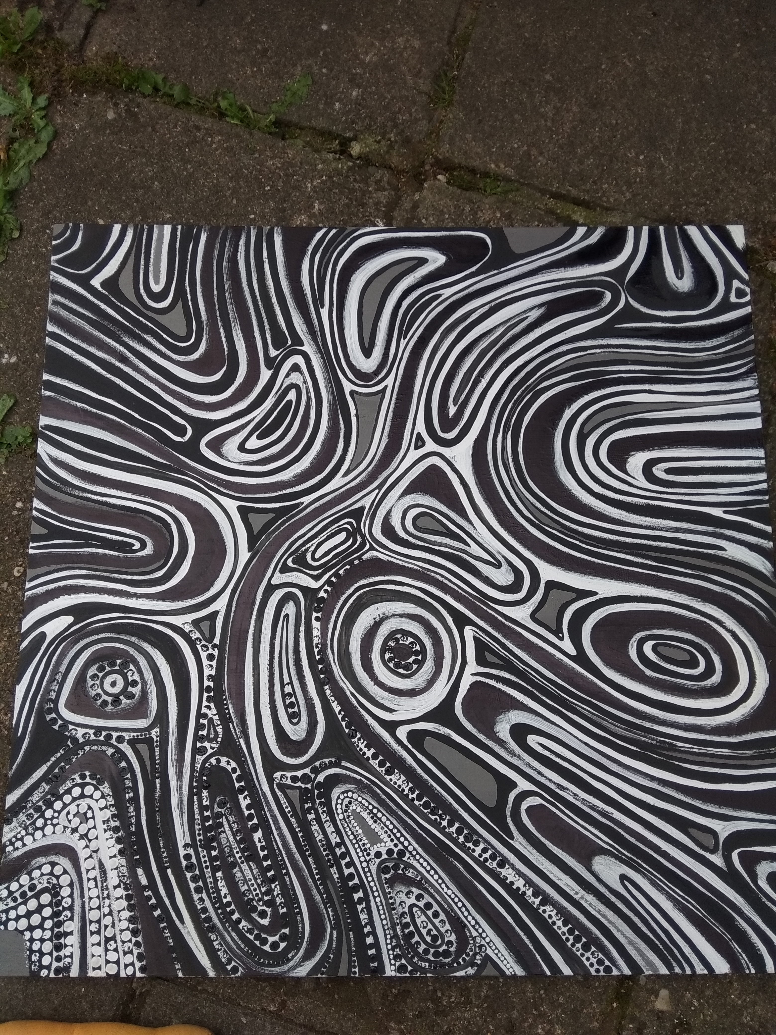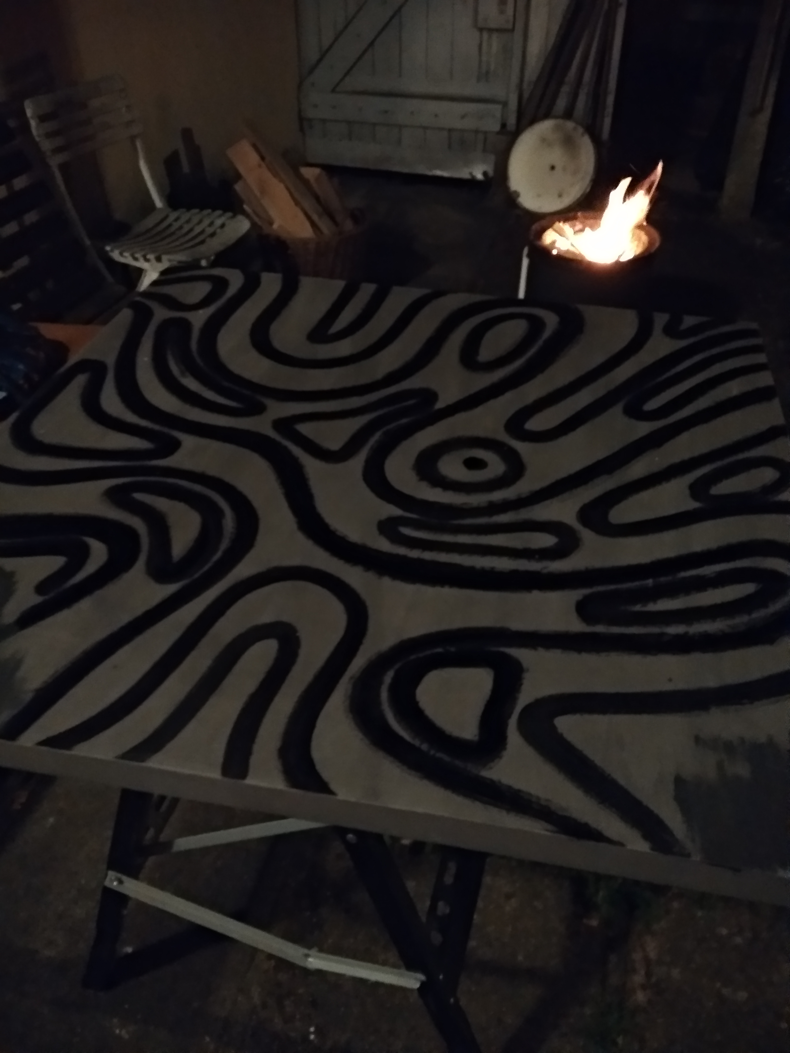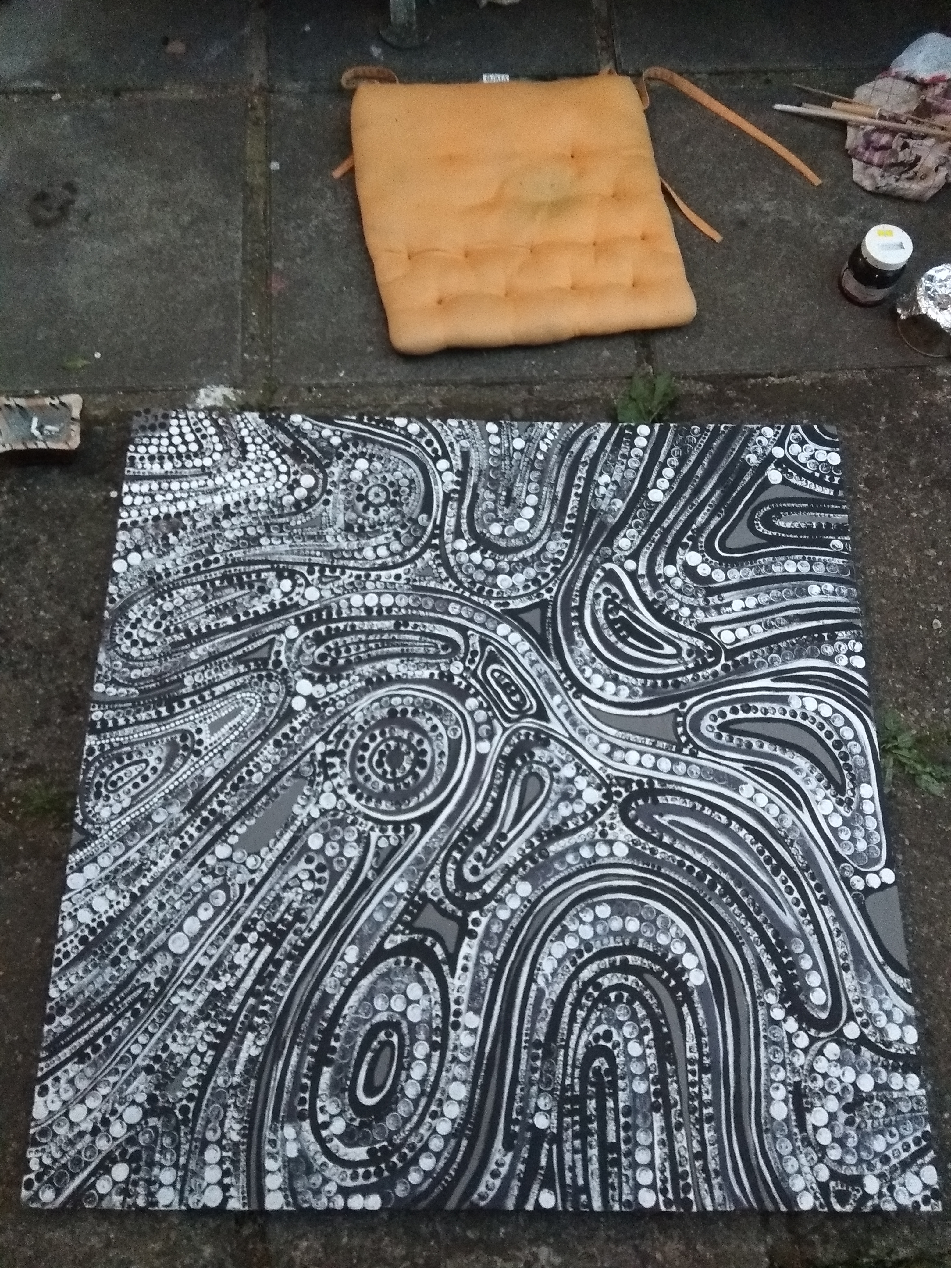 kromě toho, že kreslím mandaly, momentálně tu více " klučičí", tak maluji i tohle. Tedy pokud jsem na Vysočině kde mám možnost krámovat a kde je kopa místa. Tohle má asi metr na metr a dodělám to při příští návštěvě.