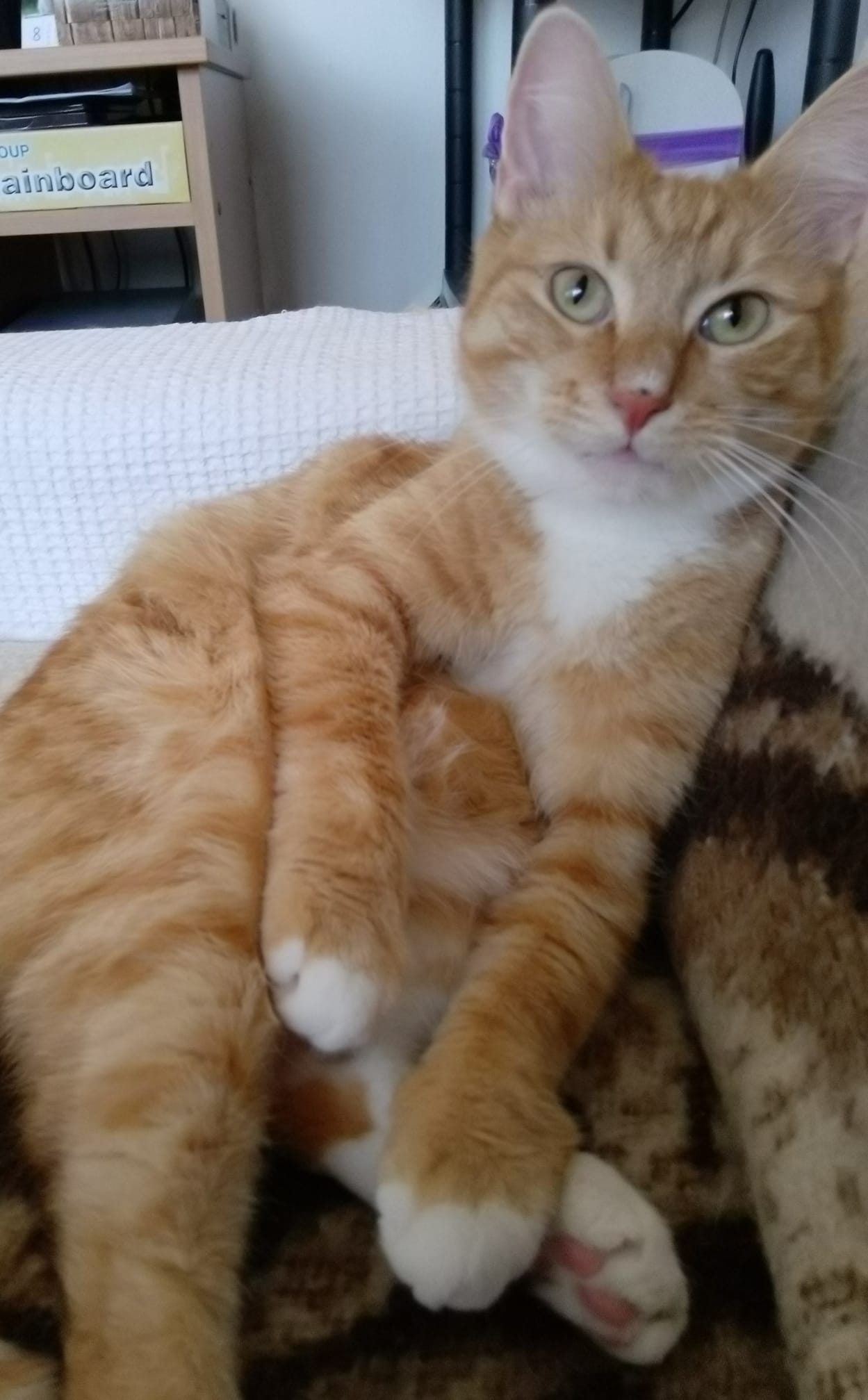 No tak jsem už u těch dvounožců rok a půl a mám nevlastního bráchu Bazzyho. Nemůžu si vlastně moc stěžovat, mám se dobře. Jen pořád platí, že se můžu přetrhnout abych dostal nějaké masíčko navíc a oni mi ho nedají. Ráno mě páníček nakrmí a odejde do práce, pak vstane panička a vůbec nereaguje na moje žebrání. Odbyde mě s tím, že masíčko už jsem dostal a maximálně mi dá ještě misku s granulema. No a se svým nevlastním bráchou si taky rozumím. Často si hrajeme, ale brácha má 8 kilo a když se na mě tem kolos v rámci hry vrhne, tak ječím a páníčči se zlobí, že děláme kravál. Jenže copak to jde neječet, když se na mě brácha svalí? Vždyť já jsem poloviční než on. Panička je taková moje náhradní maminka a já jí každý den dokazuji, jak jí mám rád. Ráno jen co vyleze z ložnice, tak jsem jí v patách a když se přede mnou zavře na záchod, tak si postěžuji. No a jí se nelíbí že kvílím na celé kolo. To jsem prý zavislák. Nebo si sedne k snídani a já se jí drápu do klína. Někdy mě nechá a já se pak pomazlím a zkouším vyžebrat něco dobrého. Jenže nedostanu nic a tak nakonec zklamaně odcházím. Taky si mou už moc nehrajou. Ráno nemají čas a odpoledne si se mnou hrají jen někdy. Aspoň že to mazlení se mnou nezanedbávají :)