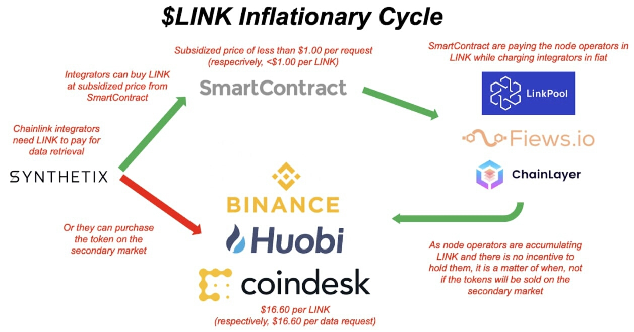 Sitting on a hefty reserve of 350,000,000 LINK created out of thin air, SmartContract is obligingly selling LINK to the Chainlink users at a staggering 90%+ discount. Presented with the options to either buy LINK for 15 USD in an open market transaction or purchase it for less than a dollar, SmartContract is the natural choice. The price, however, is not the only difference between the two options. Each time an integrator takes advantage of SmartContract’s subsidy, a new LINK token is added to the circulation, slowly but firmly putting pressure on the supply side.