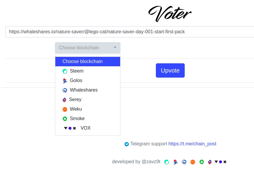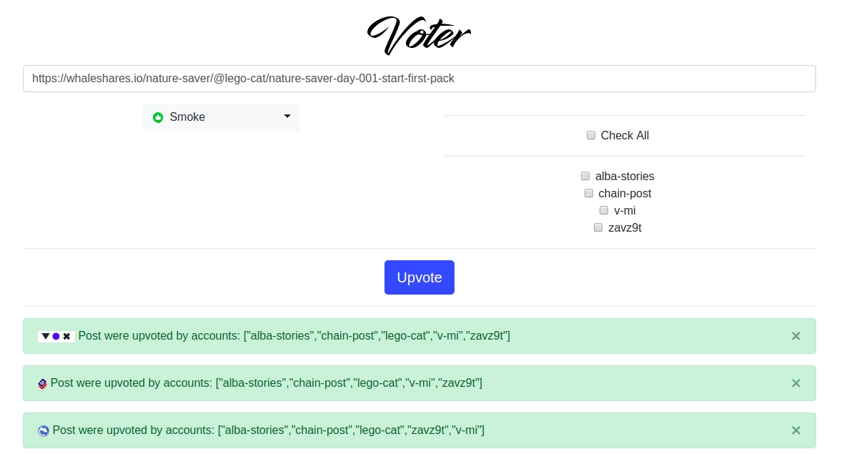 So, I decided to create form where you can vote for some posts by all your accounts which you saved at Chain Post page.
