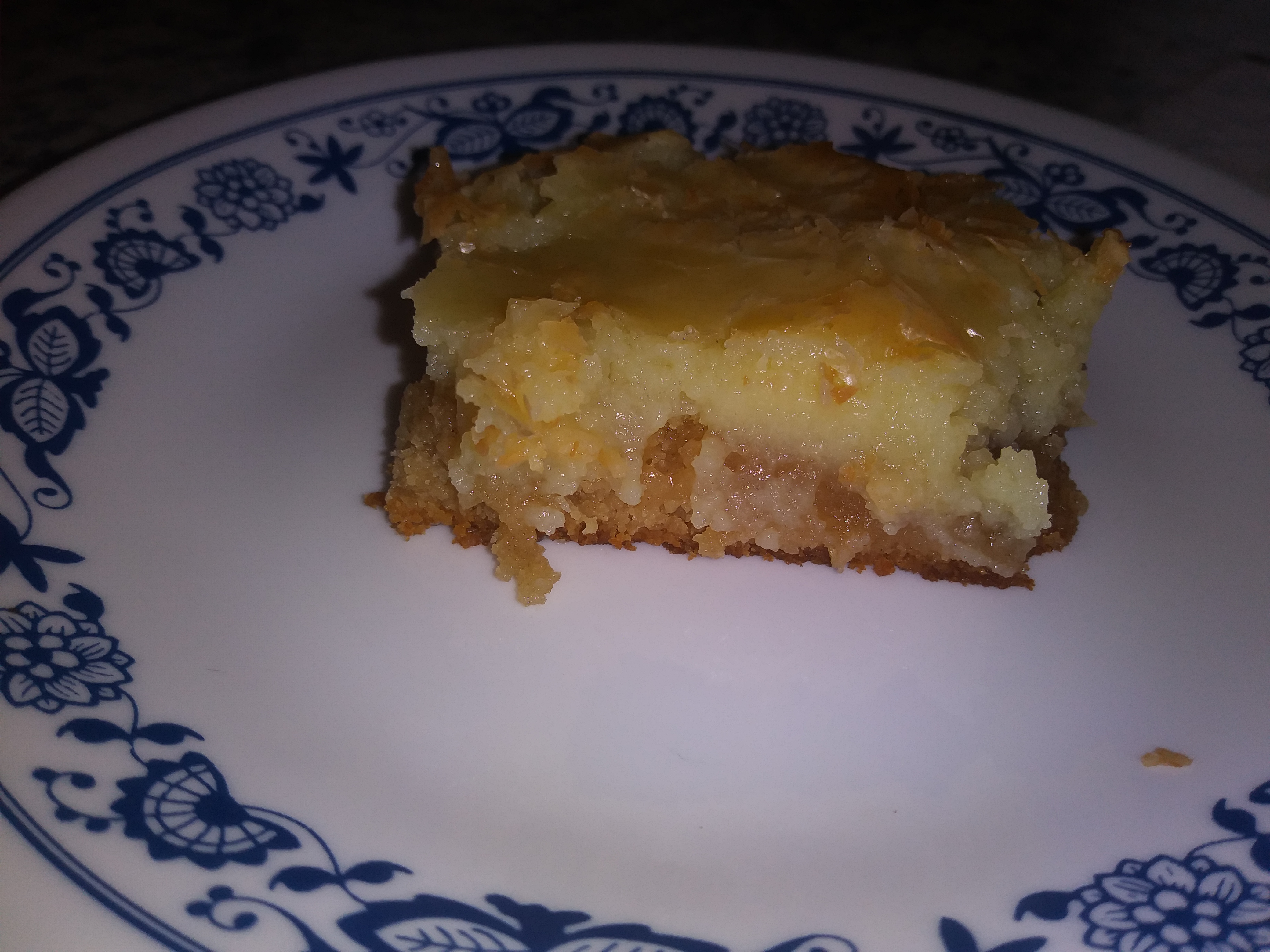 Mix together till it gets creamy it will have a yellow tint. Once it is completely mixed together it is ready to be poured over the top of the the bottom half. Once you have poured it spread it out so it is covering the bottom layer.