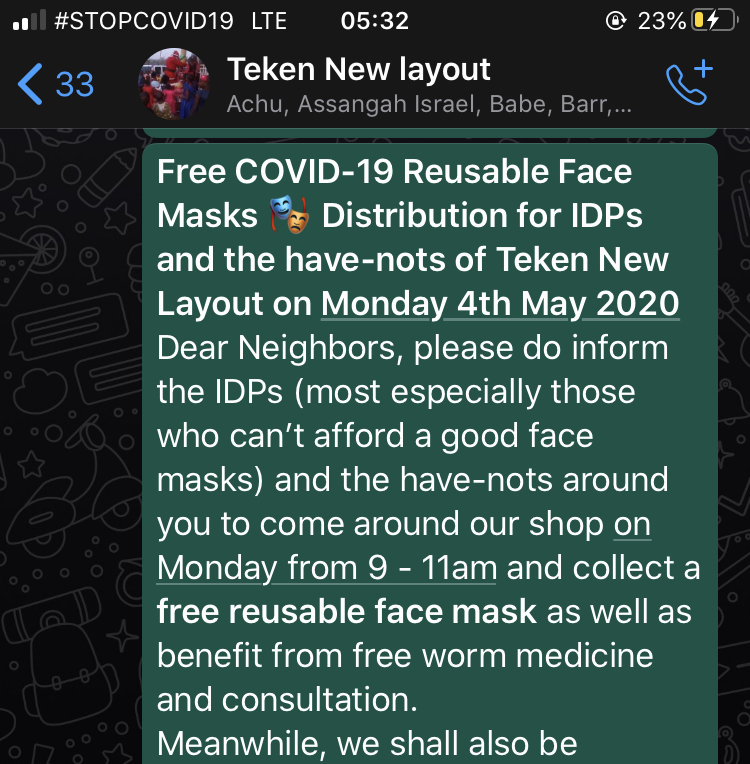 In a WhatsApp message, @mr-greens, Founder/Executive Director of The Greens has announced the first COVID-19 Reusable Face Masks 🎭 distribution activity at Teken New Layout Quarter in Mile Nkwen - Bamenda of the North West Region of Cameroon