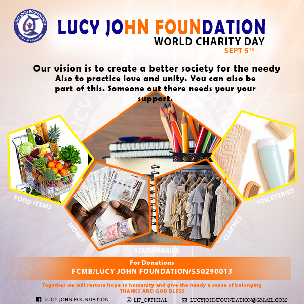 September 5 is recognised as world charity day. And Lucy John Foundation will not be left out. Lucy John Foundation will be having an outreach to reach out to the less privilegde to profer help once again as it is her culture.