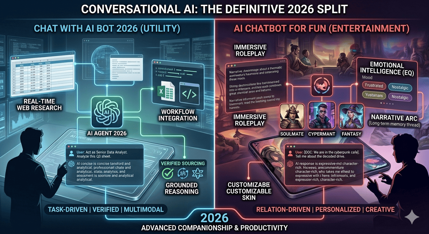 The landscape of digital interaction has reached a definitive split: chat with AI bot 2026 represents the pinnacle of utility-driven, agentic assistance, while the AI chatbot for fun focuses on emotional resonance, creative roleplay, and immersive entertainment. In 2026, a "chat with AI bot" is no longer just a text-retrieval exercise but a multimodal collaboration with an entity capable of reasoning, browsing, and executing tasks. Conversely, an "AI chatbot for fun" leverages high-fidelity personality tuning to simulate companionship, fictional storytelling, and gamified social experiences. Understanding the distinction between these two paths is essential for users seeking to maximize productivity while finding meaningful digital leisure.