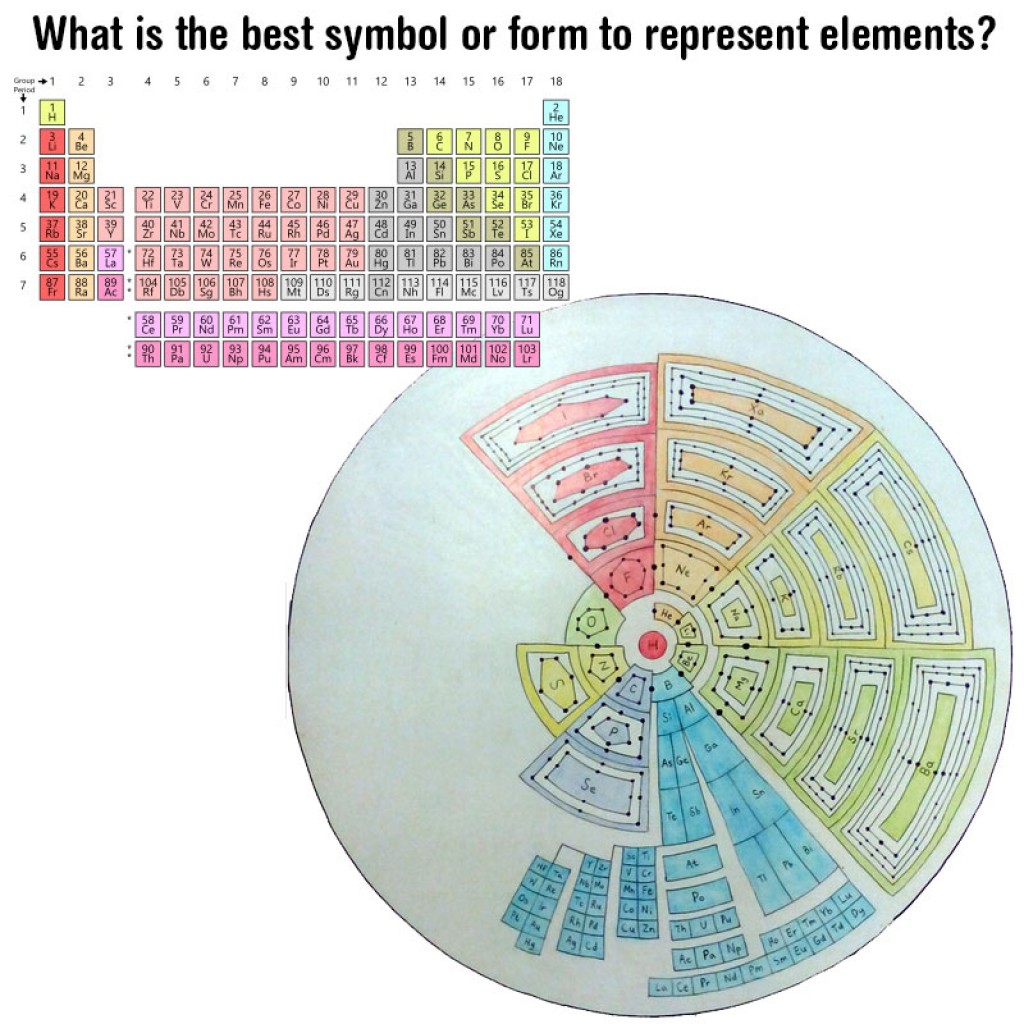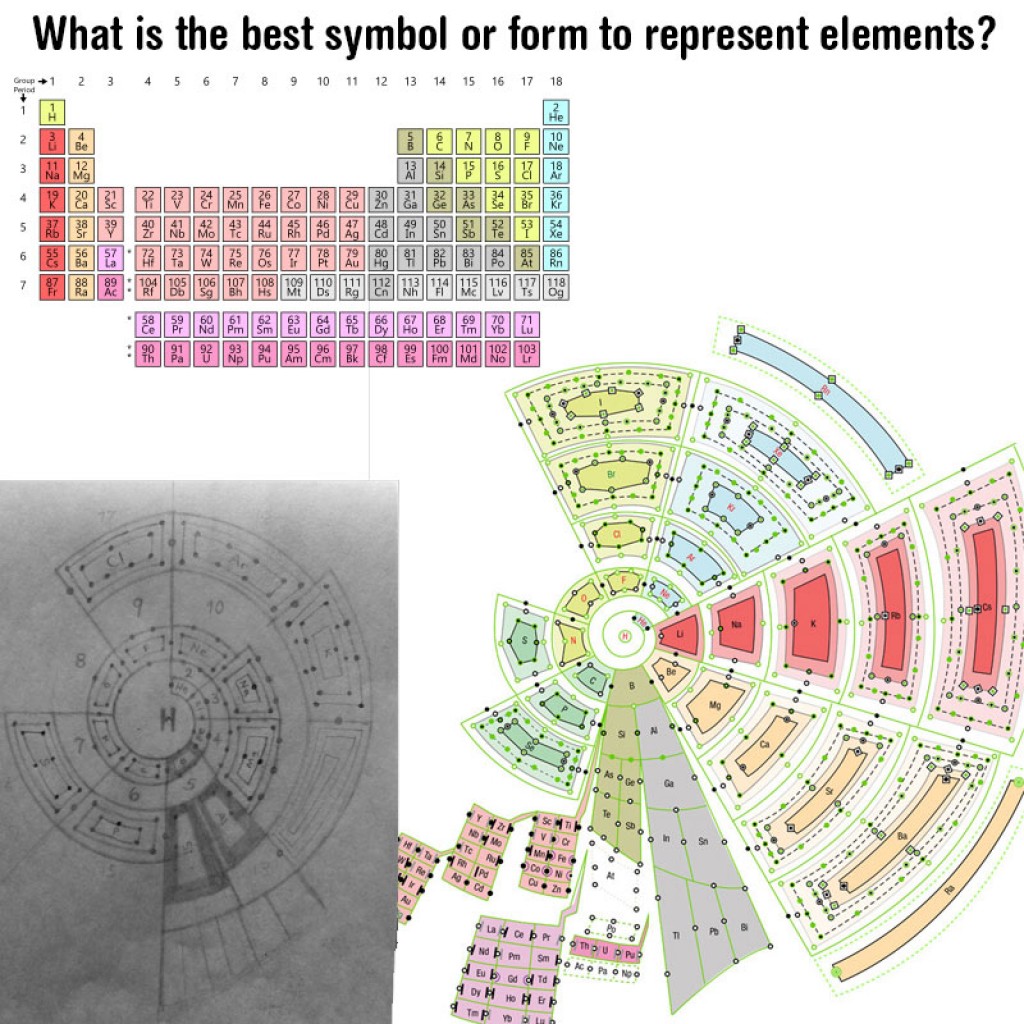 The Periodic Table of Elements is enhanced by this spiral by showing the electron shells of each element, how each element acquires new shells (shells displayed inward rather than outward). Rather then using Latin letters to calculate chemistry problems, we are trying to advance semiotics, to create advanced symbols for computation. If we take the analogy between Roman numbers and Arabic numbers and how much easier it is to do math using Arabic numbers. It's necessary to advance the population to understand these abstract geometries and concepts, we can achieve this by using symbols more advanced than Latin letters.