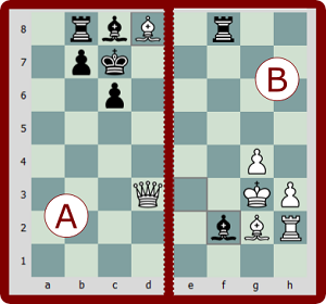 Veamos los diagramas A y B donde el Alfil es quien da el mate. En el Diagrama A el alfil está protegido por la dama y en el diagrama B el alfil está protegido por la torre. Debemos aprender este patrón para cuando tengamos esta oportunidad no la desaprovechemos.