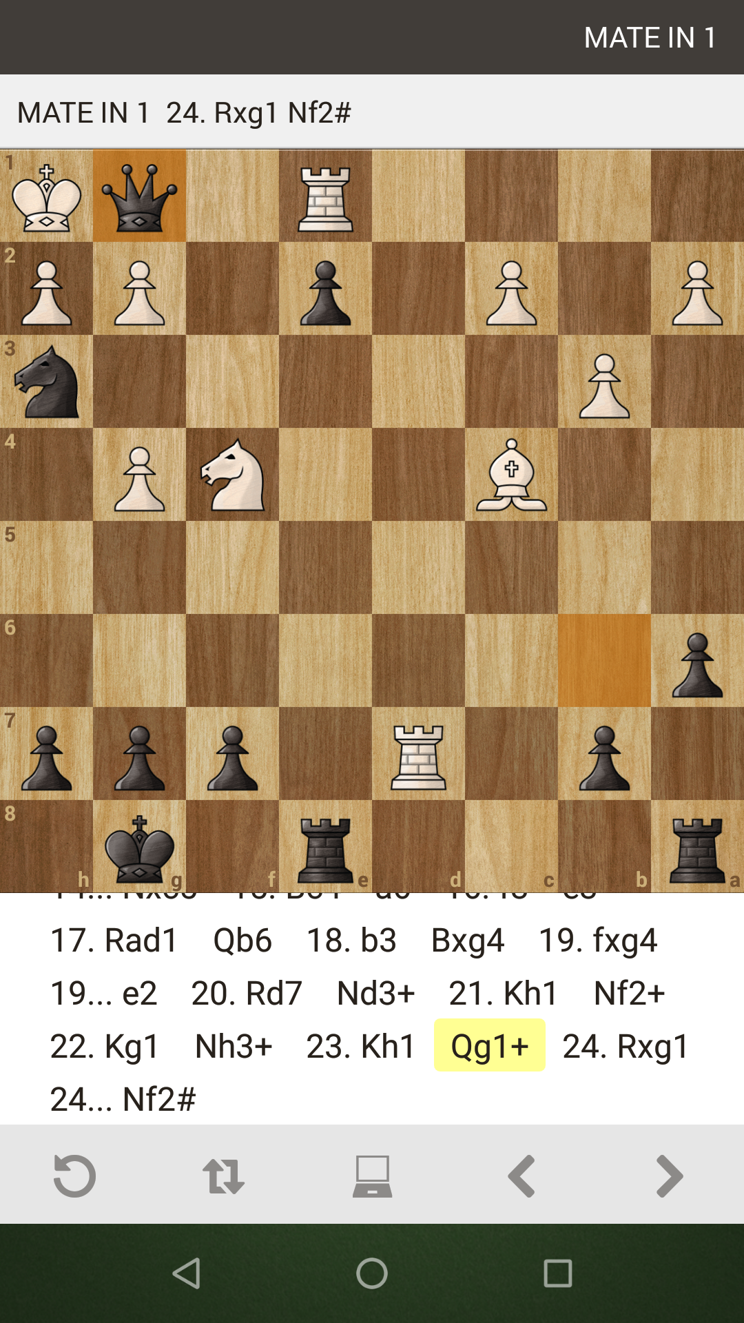 Now here's the big penultimate move for black. Play Qg1+ and sacrifice the queen!
