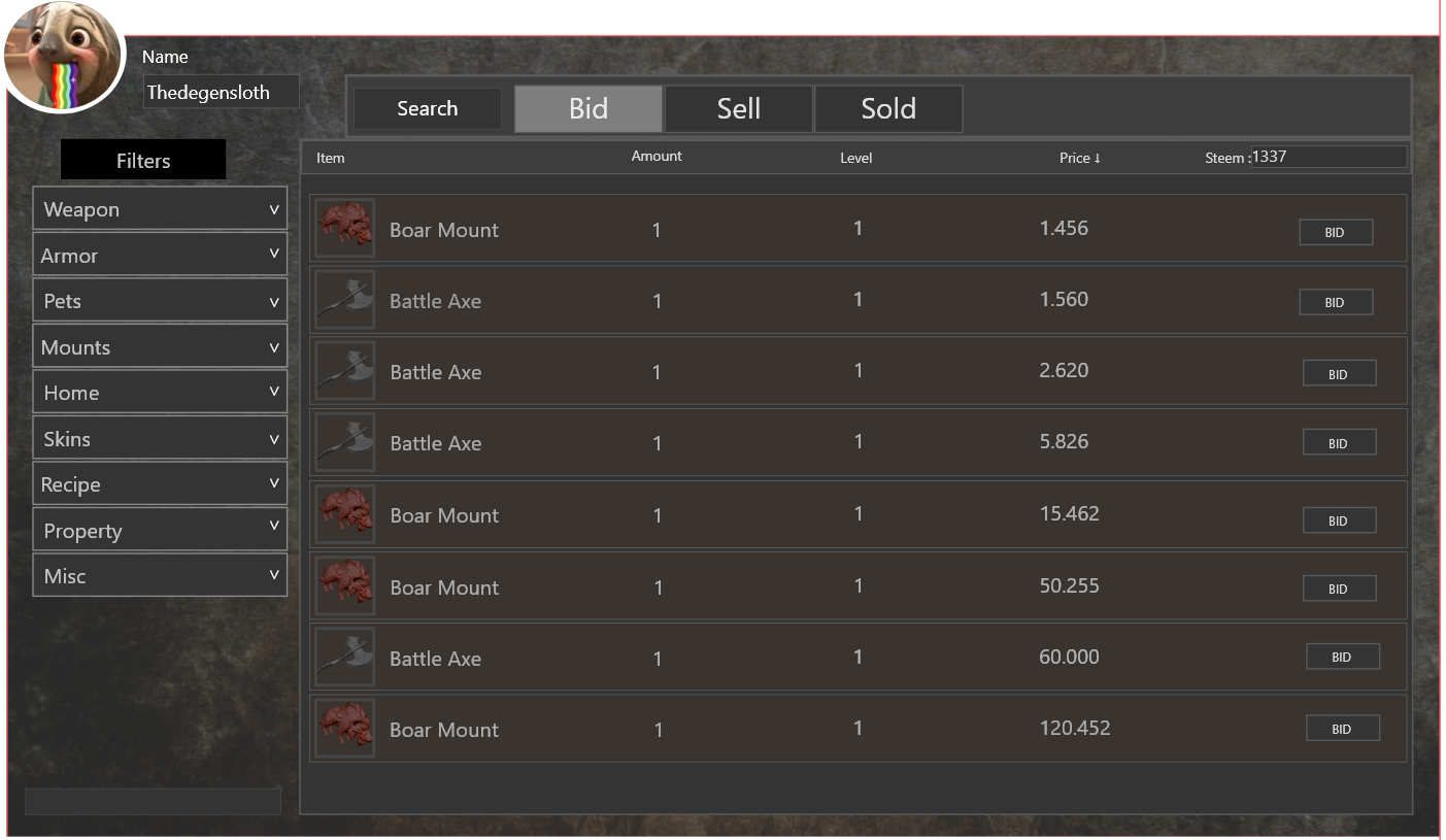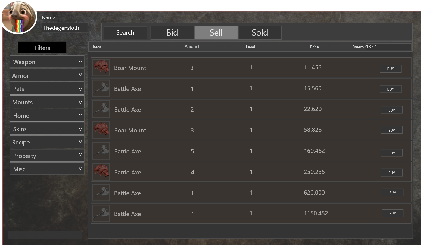 The most important thing we are constantly thinking about when designing our auction house is clarity of information. And there are several reasons for that. As previously mentioned, the auction house will be the centerpiece of our economy. It will be the place where in-game currency and cryptocurrencies (and because of that, real-world currencies) meet. Thus, achieving as much clarity of information will help our players to make informed decisions.