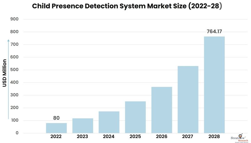 According to Stratview Research, the child presence detection system market was estimated at USD 80 million in 2022 and is likely to grow at a CAGR of 45.39% during 2023-2028 to reach USD 764.17 million in 2028.