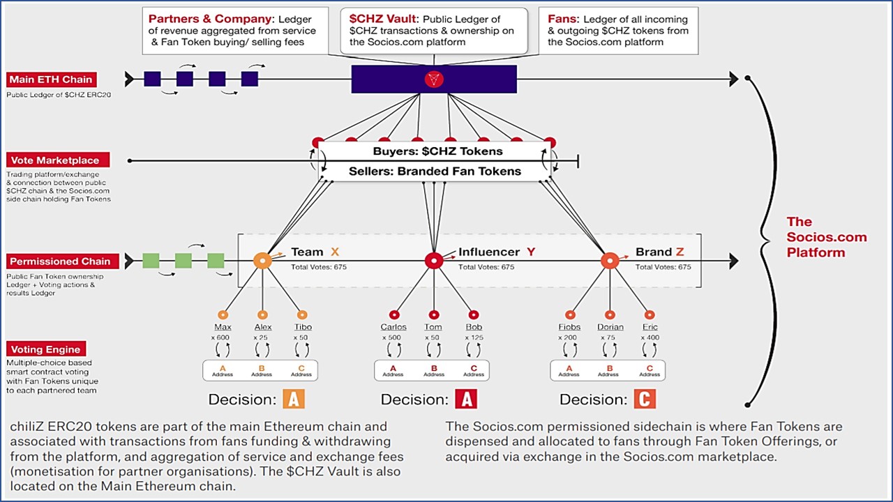 The chiliZ token will be emitted on the main Ethereum blockchain while partner specific fan tokens on the permissioned sidechain. Socios.com platform is, therefore, the only means for exchanging chiliZ tokens with fan tokens. Socios.com thus becomes the oracle of all transactions which are stored on a public ledger. This ledger is open for audit by any party wanting to know of the transactions on the chain.