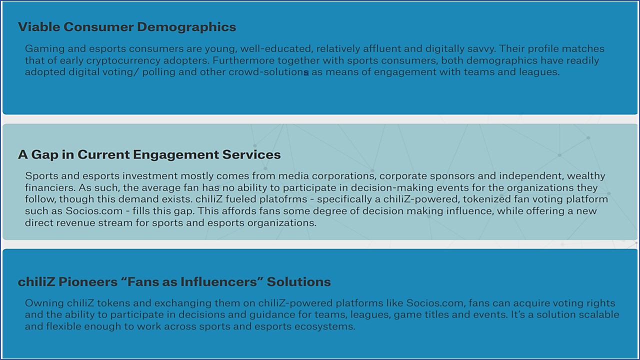 As discussed so far, chiliZ brings a blockchain solution to not only enable sports and the gaming industry to reach fans but also engage fans to participate in the decision making of sports clubs, gaming titles and events. A snapshot of the same is shown below.