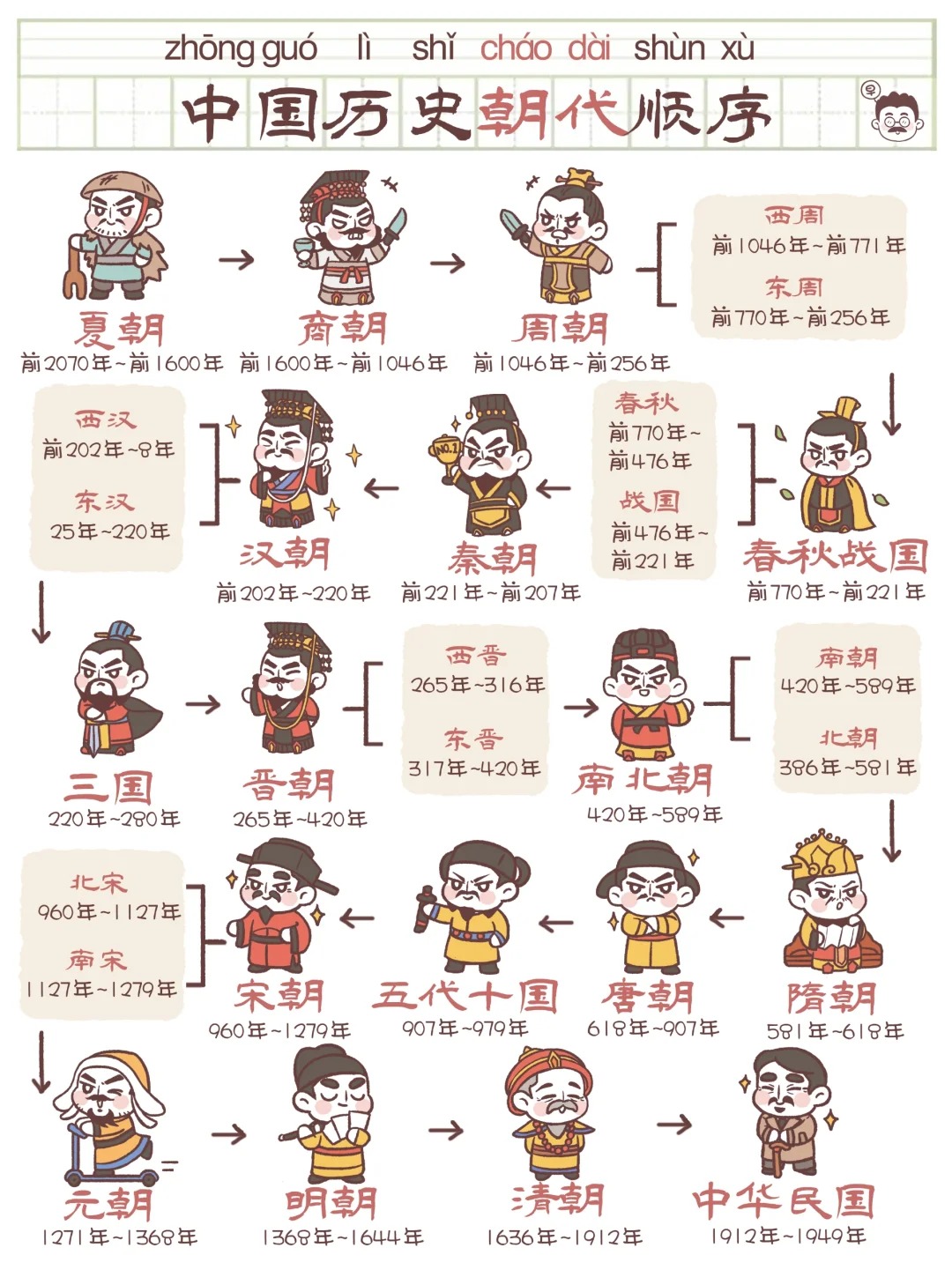 一张图弄懂中国历史朝代顺序❗alienming (26)in #china • 2 years ago 一张图弄懂中国历史朝代顺序❗ 👉中国历史朝代速记口诀: 夏商与西周,东周分两段, 春秋和战国,一统秦两汉, 三分魏蜀吴,二晋前后延, 南北朝并列,隋唐五代传, 宋元明清后,皇朝至此完。 #history