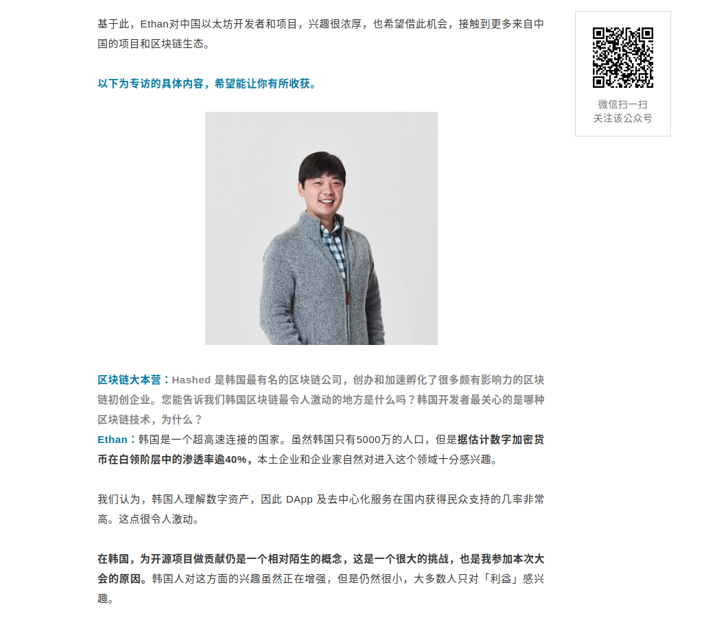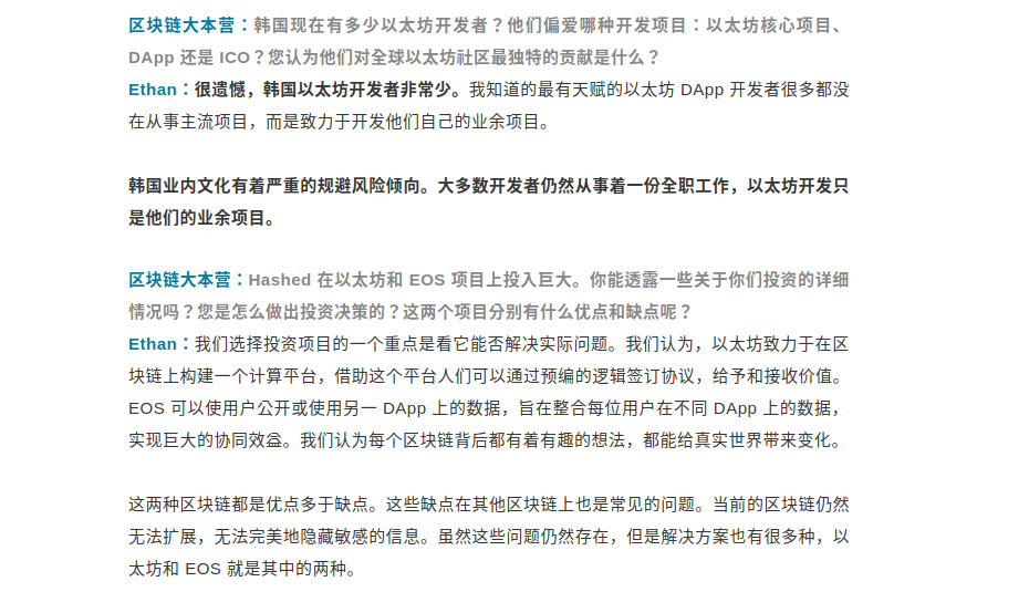 인터뷰에서 김균태CTO는 한국에 화이트칼라 근로자들의 디지털통화의 보급률은 40% 넘었지만, 상대적으로 이더리움 개발자는 적습니다. 이유는 한국 업계 문화에는 위험을 회피하는 심각한 경향이 있고, 대부분의 개발자는 정규직으로 일하고 있지만, 이더리움 개발은 아마추어 프로젝트일뿐이라고 답했습니다.