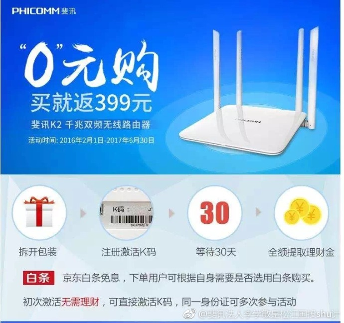 斐讯0元购调查,斐讯,京东,松江国资委三家联合割韭菜fourthclass (16)in #china • 8 years ago 斐讯“0元购”:说简单点,先花399元购买一个路由器,过一个月,399元全额返还,相当于免费送你1台路由器,同时又有“京东自营”进行宣传,吸引了众多用户上船。 斐讯大股东是松江国资委,斐讯法人李学敏是松江国投书记,斐讯监事倪新建松江金融办主任。更讽刺的是倪新建还是松江区打击非法金融的组长! 松江金融办,国投,国资委联手制造了斐讯联璧非法自融!,JD的推波助澜,累计销售近246亿元,按照jd销售提成15%计算获利近30亿,还不算广告费。2018年广告费1亿,还只是单项的,仔细看合同京东和李学敏签订,很明显联璧的钱最终流向了斐讯!