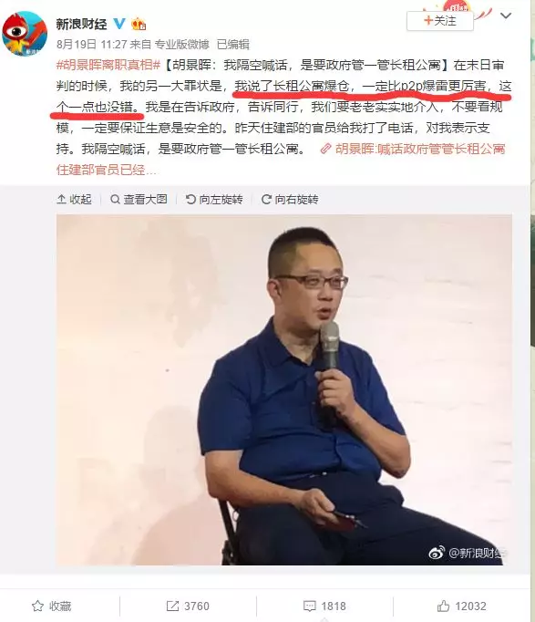 但是很少有人知道,这些人的钱是哪来的,其奥秘就隐藏在胡景晖在媒体发布会的一句话上,“我说了长租公寓爆仓,一定比P2P暴雷更厉害,这个一点也没错。”