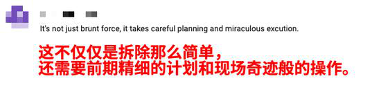 -- -- --除了惊叹“中国速度”一如既往的“快到飞起”,也有外国网友注意到这么一个细节:“这不仅仅是拆除那么简单,还需要前期精细的计划和现场奇迹般的操作。”