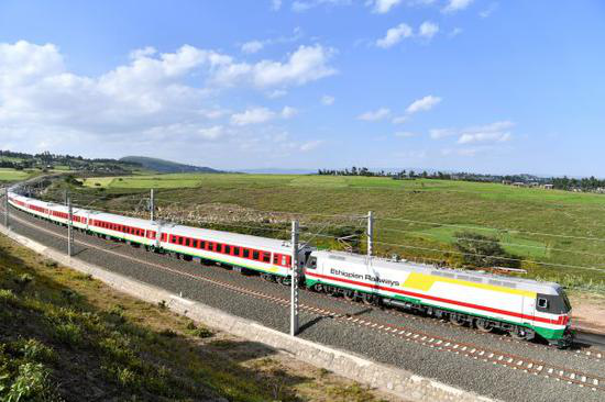 在埃塞俄比亚首都亚的斯亚贝巴附近,一列试运行列车在亚吉铁路上行驶.