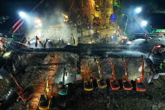 -- -- --历经两个半小时的连续同时作业后,这座跨线桥被成功拆除。