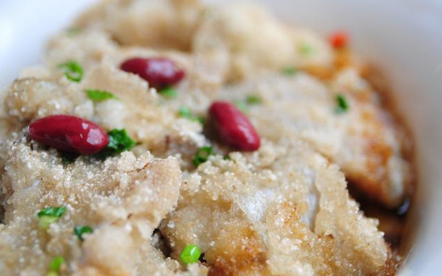 1, remove all the chicken bones, cut the chicken into pieces, put into the pot, put in the pot, then put into the salt, mash juice, minced bean, pepper, ginger rice, pepper, monosodium glutamate, soy sauce, cold soup, stir evenly after the taste, evenly spread the five fragrant rice flour on the chicken, then stir evenly, and then put into the oil again, stirring again evenly to use.
