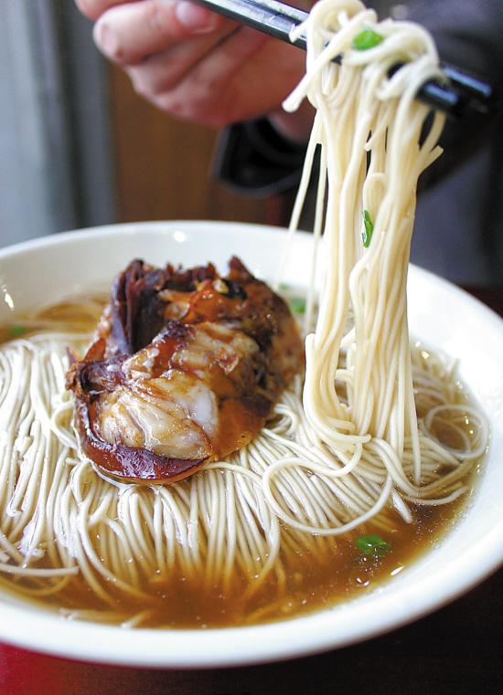 浇头面做得最讲究的老字号,是苏州的朱鸿兴,拙政园附近有一家,每次去苏博,经历了游客的喧嚣之后,也只有一晚面可作慰藉。。这家店的浇头有家常的焖肉焖蹄,也有极其金贵又富时令气息的三虾爆鳝。不仅如此,就连食器都要与浇头搭配得宜。比如蹄髈面就要用红花大碗,焖肉面则用青边大碗,虾仁面是金边大碗,除此以外,一般的面就是普通青花碗。吃面不只是吃素面,配上浇头一样是大快朵颐的一餐,苏州人有诗为证:"时新细点够肥肠,本色阳春煮白汤。今日屠门须大嚼,银丝细面拌蹄髈。"写得馋趣尽出,一派天真无邪爱吃肉的童真,让人忍俊不禁。