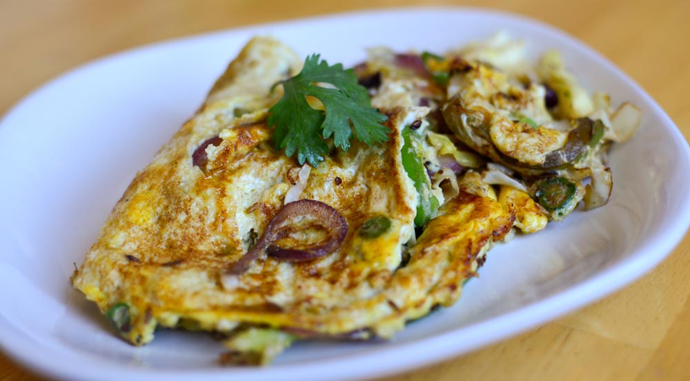 Push all the fried vegetables in the one side of the pan and add 1 tea spoon of oil, now pour beaten eggs and spread fried vegetable over egg and cook for 30 seconds one side and then gently flip the omelet to the half way and cook for 30 seconds. flip it to other side and cook for another 30 seconds. remove from the heat.