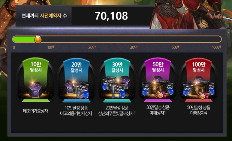 사전등록자수 10만명 달성시 '태조의 가호상자', 20만명 달성시 '마고의 용기반지 상자', 30만명 달성시 '삼신의 푸른빛 팔찌상자 1개', 50만명 달성시 '마패 상자 1개', 100만명 달성시 '마패상자 4개' 지급!