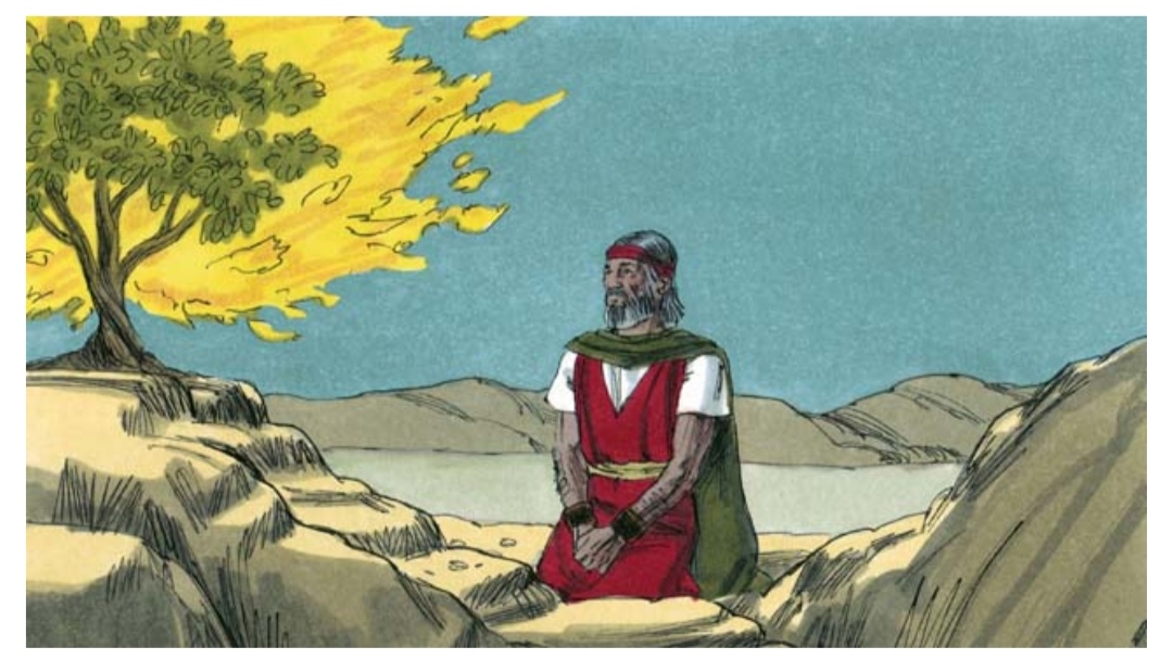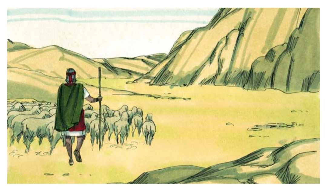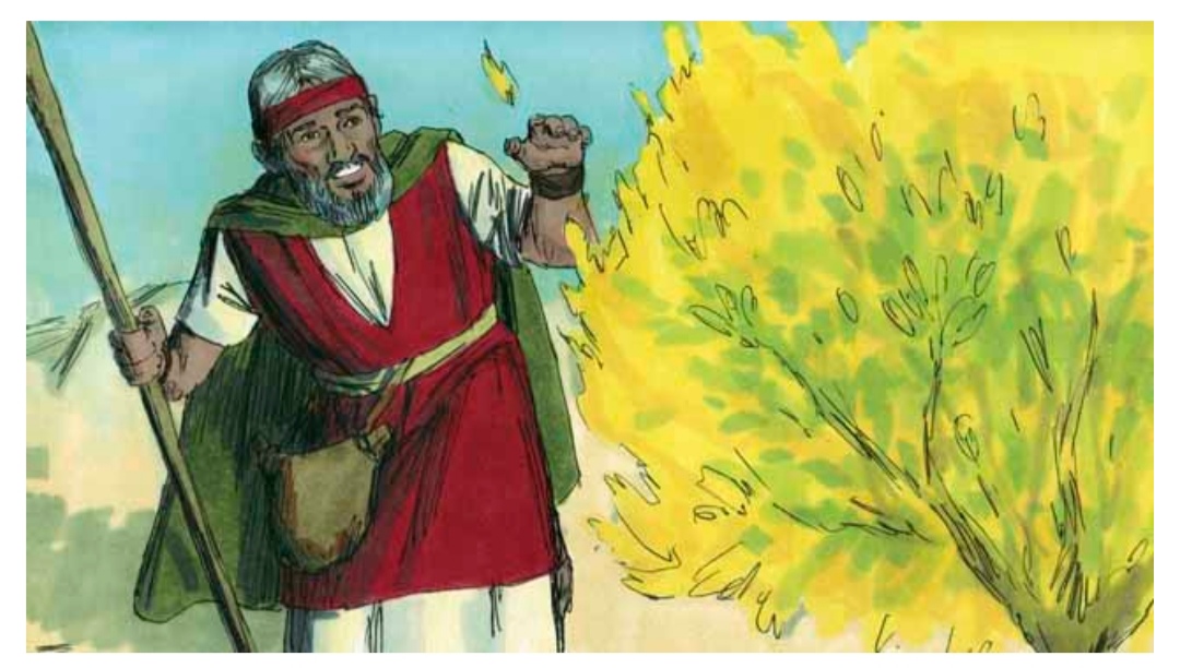 One day while Moses was taking care of his sheep, he saw a bush that was on fire. But the bush did not burn up. Moses went towards the bush to be able to see it better. As he approached the burning bush, the voice of God said, "Moses, take off your shoes. You are standing on holy ground."