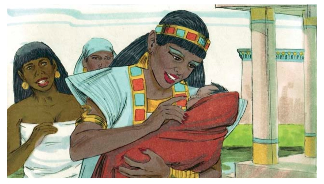 A daughter of Pharaoh saw the basket and looked inside. When she saw the baby, she took him as her own son. She hired an Israelite woman to nurse him without realizing the woman was the baby's own mother. When the child was old enough that he no longer needed his mother's milk, she returned him to Pharaoh's daughter, who named him Moses.