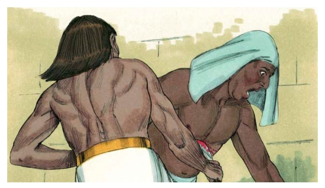 One day, when Moses had grown up, he saw an Egyptian beating an Israelite slave. Moses tried to save his fellow Israelite.