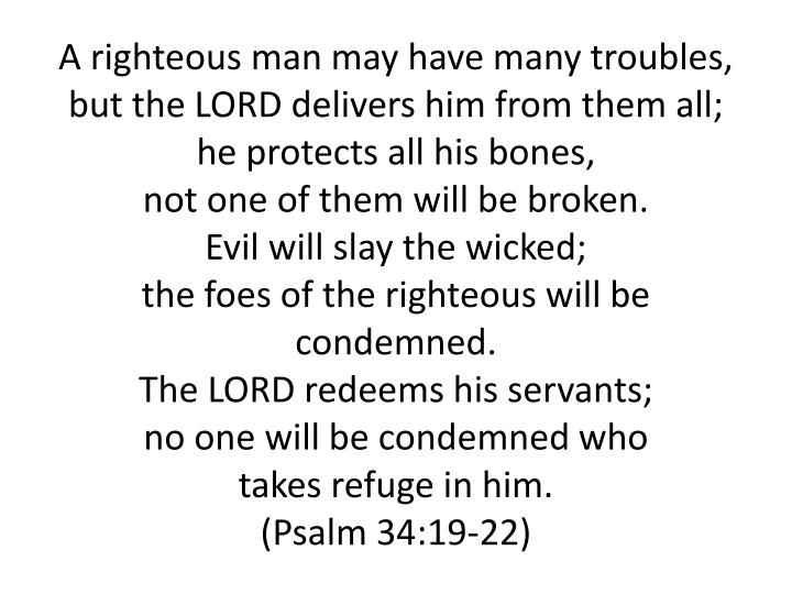 “Depart from evil and do good; Seek peace and pursue it. The eyes of the LORD are on the righteous, And His ears are open to their cry. The face of the LORD is against those who do evil, To cut off the remembrance of them from the earth. The righteous cry out, and the LORD hears, And delivers them out of all their troubles. The LORD is near to those who have a broken heart, And saves such as have a contrite spirit. Many are the afflictions of the righteous, But the LORD delivers him out of them all. He guards all his bones; Not one of them is broken. Evil shall slay the wicked, And those who hate the righteous shall be condemned. The LORD redeems the soul of His servants, And none of those who trust in Him shall be condemned.”